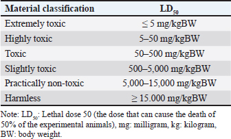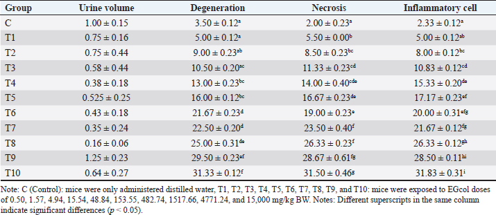 TreatmentSixty six male mice (Mus musculus starin of Deutschland, Denken, and Yoken) were randomly divided into 11 groups, namely C, T1, T2, T3, T4, T5, T6, T7, T8, T9, and T10. Distilled water (0.5 ml of distilled water was administered orally to the control group. The treatment group was given a single dose of EG orally at a dose of T1=0.5 mg/kg BW, T2=1.57 mg/kg BW, T3=4.94 mg/kg BW, T4=15.53 mg/kg BW, T5=48.84 mg/kg BW, T6=153.55 mg/kg BW, T7=482.74306 mg/kg BW, T8=1,517.66 mg/kg BW, T9=4,771.24 mg/kg BW, T10=14,999.99 ≈ 15,000 mg/kg BW. Measurement of parametersThe number of animals that died and their urine samples were collected after 24 hours of treatment. The toxicity levels of EG were examined based on the toxicity scale established by Loomis and Hayes (1996) (Table 1). Histopathological examination of the kidneys was performed to determine the level of damage to renal tubular cells. The examination used 100x and 400x magnification light microscope (Nikon Eclipse Ci) equipped with Image Raster Software Version 3.7., with observations from five fields of view. An assessment was then made in the form of scoring based on the level of damage to the renal histopathology picture. The following are the criteria (Table 2) for assessing changes in the histopathological picture of the kidneys according to Klopfleisch (2013). The collected data were analyzed using the Statistical Package for the Social Sciences (SPSS) 25.0, for Windows program using a one-way Analysis of Variance test. If there was a treatment difference, it was continued with the Games-Howell Test at p < 0.05. Data analysisData were analyzed with the Kruskal-Wallis test, and if there were significant differences (p < 0.05), then continued with the Mann-Whitney test at 95% levels of confidence. The data analysis was done using Statistical Package for the Social Sciences (SPSS) version 20 for Windows. Ethical approvalThis study was conducted at the Experimental Animal Cage of the Faculty of Veterinary Medicine, Airlangga University, Surabaya, Indonesia, between February and March 2023. The research proposal was approved by the Ethical Clearance Committee for preclinical research, Airlangga University, under ethical permission No. 227/HRECC.FODM/III/2023. ResultsLD50Acute toxicity of oral LD50 value of EG on mice was determined to be 1.598 mg/kg BW. This value falls into the slightly toxic” category according to the Loomis and Hayes (1996) toxic substance classification scale (Table 2). The calculation of the LD50 value of EG in mice (Mus musculus) was carried out using the arithmetic formula of Reed and Muench (1938). Based on the above formula, the LD50 of EGss in mice (Mus musculus) was 1.598 mg/kg BW. Based on ATSDR data in 2010, the range of LD50 values of EGcol administered orally to mice was 5,840–15,400 mg/kgBB. The difference in LD50 values can occur because of various factors, which can be grouped into three main factors: experimental animals, substances/compounds used, and external factors, including the environment and calculation methods (Casarett and Doull 1995). Table 1. Toxicity scale of toxic materials (Loomis and Hayes, 1996).