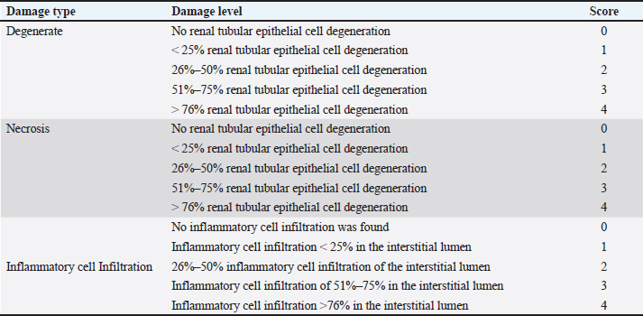 Table 5. Urine volume (ml/head/day), scores of renal tubular cell degeneration, necrosis, and inflammatory cell infiltration.