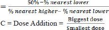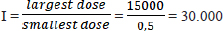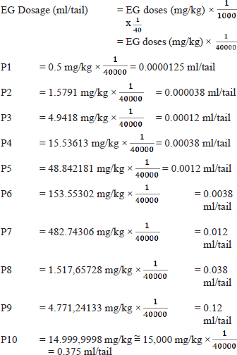 Calculation of the large multiplier factor: F=r√I =9√30000 =3,14382 Calculation of EG dose series (in mg/kg units): P1=0.5 mg/kg P2=0.5 mg/kg × 3.14382=1.57191 mg/kg P3=1.57191 mg/kg × 3.14382=4.94180 mg/kg P4=4.9418 mg/kg × 3.14382=15.53613 mg/kg P5=15.53613 mg/kg × 3.14382=48.84281 mg/kg P6=48.84281 mg/kg × 3.14382=153.55302 mg/kg P7=153.55302 mg/kg × 3.14382=482.74306 mg/kg P8=482.74306 mg/kg × 3.14382=1,517.65728 mg/kg P9=1,517.65728 mg/kg × 3.14382=4,771.24133 mg/kg P10=4,771.24133 mg/kg × 3.14382=14,999.9 ≈ 15,000 mg/kg Formula for determining LD50: LD50=Anti Log (Log A+ (B x Log C) Description: A=Dose under 50 % B=Proporsional space