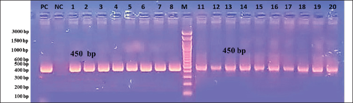 Fig. 2. PCR product of agarose gel electrophoresis of Eimeria ITS-1 sequence (450 bp), where M: 3,000 bp DNA ladder; lanes 1–9 positive samples. In comparing the present study with findings from foreign research, the results are inconsistent with those reported by another researcher (Fatoba et al., 2020), who used nested species-specific ITS-1 primers for molecular diagnosis and identified five species of Eimeria (E. tenella, E. maxima, E. acervulina, E. brunetti, and E. mitis) in South Africa. However, this finding is similar to that reported by another study (Tan et al., 2017), in which E. maxima and E. tenella were successfully identified by a distinct 278 bp band on agarose gels. Additionally, species-specific PCR for E. maxima yielded 205-bp amplicons, with positive PCR reactions obtained from fecal samples in Korea. Moreover, our findings align precisely with those reported by another researcher (Gharekhani et al., 2014), who identified all isolates as E. tenella using species-specific PCR amplification of the ITS1 rDNA region from oocysts extracted from poultry fecal samples collected across eight regions in China. In Iran, E. tenella was also identified as the dominant species, as outlined by another study (Alam et al., 2021), which detected E. maxima, E. necatrix, E. tenella, E. acervulina, and E. mitis, with a prevalence of Eimeria spp. at 31.5% (126 out of 400 samples), thus making E. tenella the most prevalent species in Khuzestan. The detection of highly pathogenic E. tenella, E. necatrix, and E. brunetti, along with the more prevalent E. acervulina and the less pathogenic E. mitis, underscores the diversity of Eimeria species in the study area. Furthermore, the use of ITS1-based PCR is recommended for the reliable diagnosis of chicken coccidiosis on a large scale to monitor its epizootiological prevalence in Bangladesh (Lee et al., 2011). Our findings were also consistent with those reported by another researcher (Patra et al., 2010), in which PCR using specific primers for E. tenella successfully amplified only the ITS1 regions of ribosomal DNA (rDNA). The primer pair designed for genus specificity and E. tenella exclusively amplified their intended target DNA, with no cross-species amplification observed from heterologous primer pairs. Notably, the percentage of the specific gene E. tenella was lower than the 59% reported in a study by another researcher (Ahmed and Albakri, 2021) for ITS1. The results of the DNA sequencing comparison between the local and global strains revealed that the ITS-1 sequences of E. tenella from this study demonstrated a high degree of similarity to E. tenella sequences available in GenBank. Specifically, there was a 95% identity with sequences from Indian species (GQ856301, JX853825.1, JX853831.1, and PP002176.1), Chinese species (JX477100.1, FJ449692.1, GQ153631.1, and FJ449691.1), and Turkish species (HQ680474.1). The genetic similarity between Eimeria isolates from local poultry and strains from countries such as China, India, and Turkey may be attributed to several factors. First, significant poultry trade in these countries may facilitate the exchange of pathogenic isolates. In addition, the shared environmental and agricultural conditions in these regions can support the adaptation of Eimeria, leading to genetic similarities. Furthermore, natural selection pressure from environmental and health factors may shape the isolates, resulting in the development of shared genetic traits. Advances in genome sequencing techniques have also enhanced the ability to compare genes among different isolates, thus making genetic similarities more apparent. These factors contribute to the observation that isolates from different regions can exhibit genetic similarities, especially given that these countries are neighboring Iraq and share overlapping borders. In contrast, the identity rate was lower at 76% with the Pakistani species (MN830381.1) and the strain isolated from broiler chickens in northern Iraq (Sulaymaniyah) (PP229210.1). This lower identity likely explains the amplification of Eimeria species by PCR. The observed genetic divergence may also be related to the size of the product, which reached 271 bp for the strain isolated from broiler chickens in northern Iraq. They demonstrated that 18S rDNA gene sequences and the ITS 1 region derived from ribosomal RNA (rRNA) genes can be effectively used for the genetic characterization and phylogenetic analysis of certain Eimeria species. Histological examinationThe cecum exhibited the strongest correlation among the diagnostic methods, showing moderate agreement between macroscopic examination and histopathology, as well as between macroscopic examination and PCR, and strong agreement between histopathology and PCR. This may be attributed to the greater intestinal content in this segment across all collected samples. The reasons for selecting the cecum for tissue sectioning were previously reported (Balestrin et al., 2022).