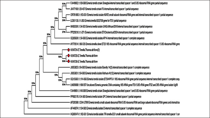Fig. 3. Phylogenetic tree analysis of E. tenella in chickens (ITS-1) partial sequence constructed using multiple alignments using MEGA X software (Version: MEGA, 11.0.11) (Kumar et al, 2018). The identified sequences are shown with red circles, followed by the obtained accession numbers. These results were compared with sequences identified in China, India, Australia, and Turkey. Light microscopic analysis of hematoxylin and eosin-stained sections showed that the histological examination of cecum samples from chickens infected with Eimeria spp. indicated monocyte infiltration in the mucosal layer and muscle fiber degeneration. In addition, desquamation of the intestinal lining cells was noted, as illustrated in Figure 4. Eimeria parasites, which cause coccidiosis in poultry, induce significant pathological changes in the cecum of infected birds. These changes generally encompass as follows: Mucosal Damage: The parasite invades the intestinal epithelium resulting in necrosis and shedding of the mucosal layer, thereby compromising the integrity of the intestinal lining, as depicted in Figure 3. Monocyte Infiltration: There is an infiltration of monocytes and other immune cells in response to the infection, indicating an inflammatory response, as shown in Figures 4 and 5. The infiltration was pronounced, particularly involving eosinophils and macrophages, as illustrated in Figures 5 and 6. These findings were consistent with previous observations (Nonkookhetkhong and Chalalai, 2021), indicating that monocytes were the most effective white blood cells in response to E. tenella infection, with monocytosis associated with this infection. This is consistent with another study on Eimeria sp. infection (Taubert et al., 2009). As explained by Qureshi (2003), monocytes and macrophages operate through chemotaxis, which involves their migration toward an inflammatory gradient. As noted in monocyte infiltration, there is an infiltration of monocytes and other immune cells in response to the infection, indicating an inflammatory response, as shown in Figures 5 and 6. The infiltration was pronounced, particularly involving eosinophils and macrophages, as illustrated in Figures 6 and 7. These findings were aligned with previous observations (AL-Saegh, 2018), indicating that monocytes were the most effective white blood cells in response to E. tenella infection, with monocytosis associated with this infection. This result is consistent with that of another study on Eimeria sp. infection (Chapman, 2001). As explained by Alzib and Abdelnabi (2017), monocytes and macrophages operate through chemotaxes, which involves their migration toward an inflammatory gradient. The clusters of developmental stages of the Eimeria parasite, including schizonts and oocysts, were also noted. Additionally, necrosis and hemorrhage were observed in the submucosal and muscular layers, as shown in Figures 5 and 6. This result was inconsistent with an observation (Adamu et al., 2013) that only a small number of E. brunetti oocysts were found, and no schizonts were identified. Helal et al. (2019) observed that while a significant number of E. tenella oocysts and clusters of large schizonts were present, only a small number of E. brunetti oocysts were identified, and no schizonts were found. The cells lining the intestine may undergo shedding, further disrupting the absorptive surface of the brush border and contributing to diarrhea and malabsorption. The findings of this study are consistent with those reported by Helal et al. (2019). Villus atrophy and destruction of the brush border were also noted, as shown in Figures 6 and 7. The cause was linked to Zulpo et al. (2007), who noted that Eimeria spp. disrupt the balance between cell proliferation and extrusion in intestinal villi, resulting in cell loss. Two phases of the Eimeria sp. life cycle occur within epithelial cells, leading to their destruction. In this study, the histopathological findings of atrophy and increased spacing between intestinal villi in experimentally inoculated broiler chickens were consistent with the findings reported previously. In cases of severe injury, significant bleeding was observed due to the developmental stages of the Eimeria parasite. There was notable infiltration of inflammatory cells, particularly mononuclear cells, accompanied by necrosis in the submucosal layer and fluid accumulation in both the muscular and submucosal layers, as shown in Figures 6 and 8. The bleeding can be linked to the presence of developmental forms such as oocysts and schizonts. This observation is consistent with the findings of Chanie et al. (2009), who noted a large number of oocysts, schizonts, and extensive tissue damage in the ceca, indicating the severity of E. tenella infection. The second-generation schizont, known for causing substantial tissue damage, hemorrhage, disruption of the cecal glands, and destruction of both the mucosal and muscularis layers, has been identified as the most harmful stage of E. tenella (Jihad et al., 2021).