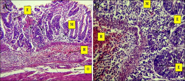 Fig. 5. Histopathological changes in Eimeria tenella infection in poultry. A. Clusters of Eimeria different (E) developmental stages with severe hemorrhage and heavy infiltration of mononuclear cells (M) with submucosal necrosis and submucosal and muscularis with severe hemorrhage (H). Severe edema (O) appears in the submucosa and muscularis 4× H&E. B. Different stages of Eimeria (E) in the epithelium of crypts and mucosa with severe and infiltration of mononuclear cells (M), mainly eosinophils, in the submucosa. There is severe hemorrhage (H): 40× H&E.