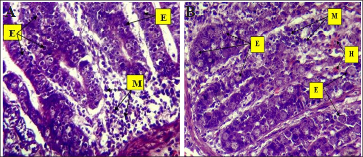 Fig. 7. Histopathological changes in Eimeria tenella infection in poultry. A. Higher magnification of different stages of Eimeria schizonts (E) in the epithelium of crypts and brush borders of villi with severe infiltration of mononuclear cells (M), mainly eosinophils and macrophages in the submucosa: 40× H&E. B. Higher magnification image of heavy infestation of Eimeria schizonts (E) in the crypts with high infiltration of mononuclear cells (M) and hemorrhage (H) in the submucosa: 40× H&E.