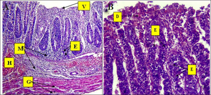 Fig. 4. Histopathological changes in Eimeria tenella infection in poultry. A. Desquamation of epithelial enterocytes lining villi (D), mononuclear cell (M) infiltration in mucosa, and degeneration of muscle fibers 4× H&E. There is marked degeneration (G) muscular smooth fibers (G). B. Clusters of Eimeria at different developmental stages (E) with severe hemorrhage (H). There is heavy infiltration of mononuclear cells (M) with necrosis (N) of the submucosa and severe edema (O) in the submucosa and muscularis: 4× H&E.