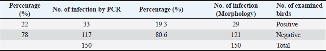 The tissue was then processed according to the standard protocol described by Bancroft and Stevens (2002). The procedures included: first, fixing the samples immediately after dissection in 10% formalin for a period ranging from 24 to 48 hours. After fixation, the samples were washed with running water for half an hour to remove any residual fixative. Next, dehydration was performed using a series of alcohol solutions, starting with 50%, followed by 60%, 70%, 80%, 90%, and finally 100%, with each concentration applied for 2 hours. Subsequently, clearing was achieved using xylene twice, with each solution lasting for half an hour. The tissue specimens were infiltrated by placing them in paraffin wax at 58°C–60°C for two sessions of 2 hours each. After infiltration, the specimens were embedded in paraffin wax and allowed to cool for 24 hours. The specimens were then sectioned to a thickness of 5–7 µm using a rotary microtome. For mounting, a thin smear of Mayer’s egg albumin was applied to fix the sections onto glass slides. Rehydration was performed using an alcohol series, starting at 100%, followed by 95%, and finally 90%. Finally, the specimens were stained with hematoxylin and eosin (H&E), and the slide was mounted by adding DPX before placing a cover slip over the sections on the glass slides (Suvarna et al., 2013). Statistical analysisThe case–control test was applied in SPSS to determine the statistical significance of the data. A p value of <0.05 was considered significant. ResultsMacroscopic examinationIn the macroscopic examination, the predominant pathological signs observed in most infected chickens are substantial hemorrhage in the cecum, which can be either liquid or clotted. The ceca walls are noted to be dark brown, appearing almost black in color. Microscopic examinationThe microscopic examination results indicated that the infection rate was 19.3% among 150 samples taken from intestinal contents suspected of being infected with Eimeria sp. (Table 3). In this study, traditional microscopic examination revealed that 19.3% of the samples were indeed infected with Eimeria species. This infection rate aligns with the findings reported by a researcher, which indicated a total Eimeria species infection rate of 19.3% in house-reared chickens from Muthanna Governorate (Fig. 1). Molecular examinationDNA extraction was successfully performed on 150 samples collected from the cecum of chickens suspected of coccidiosis, particularly those exhibiting bloody diarrhea. After confirming the presence of eggs through microscopic examination, these samples were selected for molecular analysis. The results of the molecular examination revealed that the percentage of chickens infected with Eimeria sp. was consistent at 22%, as shown in Table 2. A single infection of E. tenella was observed. Among the samples, 22% tested positive, indicating successful ITS-1 amplification using conventional PCR techniques. Furthermore, the results confirmed that all field isolates were identified as E. tenella, as they produced a specific DNA fragment of 450 bp, resulting in a DNA product within a defined size range (Fig. 2). DNA sequencer technique and phylogenetic analysisThe genetic tree diagram was generated using the molecular sequence of ITS-1. The genetic analysis revealed similar genetic affinity among the local species. Three PCR-positive samples underwent DNA sequencing to identify avian Eimeria species molecularly, and the results confirmed that the samples were diagnosed as E. tenella (NCBI-registration numbers: H240724, H240725, and H240726), as illustrated in Figure 3. DiscussionThis percentage of infection was comparable to the 10% infection rate documented by another study on broiler chickens in Sudan (Alzib and Abdelnabi, 2017). However, this rate is considered low compared with the 87% infection rate reported in China (Huang et al., 2017). In Iran, the prevalence rate was found to be 31.8%, while a separate study in Tabriz, northern Iran reported an infection rate of 55.96% (Nematollahi et al., 2009). Additionally, another report indicated an infection rate of 30.68% in Diwaniyah Governorate (Meteab et al., 2021). Several factors may have significantly contributed to the reduction of the infection rate in Diwaniyah. Among these factors is the maintenance of environmental cleanliness, which minimizes the presence of viruses and parasites, thereby reducing the risk of infection. In addition, decreasing the number of birds in designated spaces can lower the risk of disease transmission. Providing appropriate care, including vaccination and regular medical examinations, further reduces the risk of infection. Table 3. Infection rates of Eimeria spp. microscopically and by PCR.