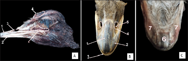 Fig. 1. External views of the adult ostrich head. A) Photograph (dorsolateral view) showing: 1- Upper beak, 2- Lower beak, 3- Nostril, 4- Frontal sinus, 5- Infraorbital sinus. B) Photograph of the maxillary ramphotheca (dorsal view) showing: 1- Culmen, 2- Tomium (maxillary part), 3- Gonys (mandibular rhamphotheca), 4- Nostril, 5- Rostral nasal concha. C) Photograph of the mandibular ramphotheca (ventral view) showing: 6- Gonys and 7- Tomium (mandibular part).