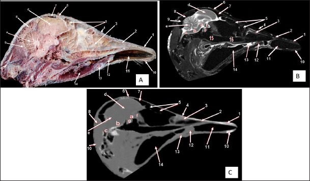 Fig. 2. Sagittal cross section of the adult ostrich head—level 1. A) Photograph of median sagittal anatomical section. B) MRI and C) computed tomography images showing: 1- Os premaxillare, 2- Culmen, 3- Nasal septum, 4- Os nasale, 5- Frontal sinus, 6- Frontal bone, 7- Cranial cavity, 8- Os parietale, 9- Os supraccipitale, 10- Os dentale, 11- Oral cavity, 12- Tongue, 13- Basihyoid, 14- Larynx, 15- Os basisphenoidale, 16- Vomer, and a- Optic lobe, b- Pons, c- Medulla oblongata, d- Cerebral hemisphere, e- Cerebellum, f- Optic chiasma and g- Pituitary gland. The caudal nasal concha is the smallest triangular one. In cross-section, it appeared scroll-like, attached rostrally to the middle one, making it difficult to differentiate between them. While caudally, the ventral nasal meatus was connected to the infraorbital sinus and the oropharyngeal cavity by two slits (or holes) in the palate called choanae. Paranasal sinusesTwo paranasal sinuses were detected, triangular-shaped infraorbital and two identical frontal sinuses as the infraorbital paranasal sinus was identified as a triangular chamber rostroventral to the orbit (Figs. 3 and 8A), while the frontal paranasal sinuses were positioned dorsally, separating the cranial and nasal cavities. There were two frontal sinuses, one on the right and one on the left, separated by a bone septum in the center. The frontal sinuses were found between the frontal and nasal bones, dorsally and laterally, between the lacrimal and vertical plates of the ethmoidal bone (Figs. 2, 3, 4, 7D, 8, and 9A). All last structures were compared and verified by CT and MRI, to guarantee precise identification and labeling; the anatomical section structures for each cross-section level were matched to their corresponding MRI and CT images. In CT images, the bones appeared white (high CT density), the gaseous parts were black (the lowest attenuation), and the soft tissue was grey (low-to-intermediate CT density). In MR images, bones appeared white (high signal intensity), the gaseous parts were black (no signal intensity), and the soft tissue was grey (low-to-intermediate signal intensity).