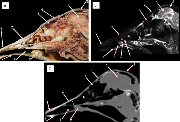 Fig. 4. Sagittal cross section of the adult ostrich head—level 3. A) Photograph of a paramedian sagittal anatomical section (medial view). B) MRI and C) computed tomography images showing: 1- Os premaxillare, 2- Os nasale, 3- Frontal sinus, 4- Processus.frontalis, 5- Cerebral hemisphere, 6- Os frontalis, 7- Os dentale, 8- Oral cavity, 9- Tongue, a- Middle nasal concha (rostral part), b- Middle nasal concha (caudal part), c- Ventral nasal meatus and d- Vomer.
