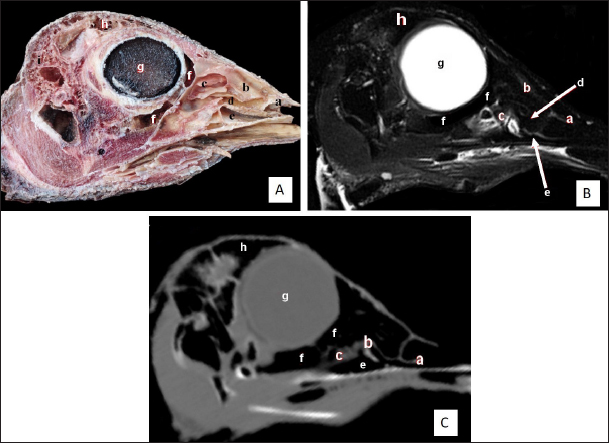 Fig. 5. Sagittal cross section of the adult ostrich head—level 4. A) Photograph of paramedian sagittal anatomical section (medial view). B) MRI and C) computed tomography images showing: a- Rostral nasal concha, b- Middle nasal concha, c- Caudal nasal concha, d- Middle nasal meatus, e- Ventral nasal meatus, f- Infraorbital sinus, g- Orbit containing eye ball, h- Frontal sinus and i- Os temporalis. The nasal conchae exhibited in the MRI images as bright (high or hyperintense signal intensity) to gray (low or hypointense signal intensity) structures that could be divided into three parts: rostral, middle, and caudal conchae, which correlated to the morphological examinations. In contrast, the nasal conchae could not be recognized clearly on CT images compared to those obtained after MRI (Figs. 2–5 B and C). The paranasal sinuses with other structures could be identified using both CT and MRI. The nasal septum and paranasal sinuses revealed a white bone border (high signal intensity), soft tissue was grey (low-to-intermediate signal intensity), and they contained black gas, so both the CT and MRI scans showed little signal intensity (Figs. 1–5B and C and 7–9B, C, E, F). Oropharyngeal cavityThe characteristic ostrich beak was made up of the top jaw (premaxilla) and lower jaw (mandibular symphysis and dentary bones), as well as their keratinized covers (maxillary and mandibular rhamphotheca) (Fig. 1). The beak had a triangular form with a thin rostral apex. The maxillary rhamphotheca had a median culmen and lateral tomium, whereas the mandibular rhamphotheca had a median gonys and lateral tomium (Fig. 1B and C). The oropharyngeal cavity appeared compressed dorsoventrally, similar to the shape of a bell, and supported dorsally by the palate and ventrally by the mandible. The ostrich’s tongue was tiny and located on the floor of the oropharynx (Figs. 2–4 and 6D). Oropharyngeal CT and MRI studies confirmed the anatomical findings. MRI provided a greater appreciation and visualization of the various soft tissue structures than CT scanning (Figs. 2–4 and 6E and F).