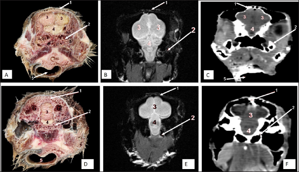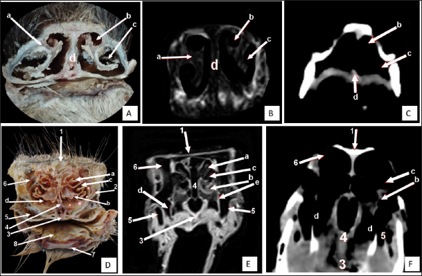 Fig. 6. Rostral-caudal cross sections of the adult ostrich head—level 1. Rostral views of A) photograph of an anatomical cross section, B) MRI and C) computed tomography images (rostral view) showing: a- Rostral nasal concha, b- Dorsal nasal recess, c- Ventral nasal recess, d- Nasal septum. Caudal views of D) an anatomical section photograph, E) MRI and F) computed tomography images showing: 1- Os nasale, 2- Os maxillare, 3- Vomer, 4- Nasal septum, 5- Infra orbital sinus, 6- Frontal sinus, 7- Mandible, 8- Tongue, a- Middle nasal concha (bulla), b- Middle nasal concha, c- Middle nasal meatus, d- Ventral nasal meatus, and e- Rostral nasal concha mucosal fold. Cranium and brainThe ostrich’s cranial cavity was bounded by frontal bone dorsally, basioccipital and basisphenoid bones ventrally, supraoccipital and parietal bones caudally, interorbital septum rostrally, and temporal bone laterally. The parietal, sphenoid, and temporal bones were pneumatic (Figs. 2, 3, 9, and 10). The brain was divided into three parts: the hindbrain (medulla oblongata and cerebellum), the midbrain (cerebrum’s peduncles and optic lobes), and the forebrain (thalamus, pineal body, hypophysis, optic tracts, and chiasm, cerebral hemispheres, and olfactory lobes) (Figs. 2, 9, and 10). The sagittal section of the brain includes the olfactory bulb, cerebrum, cerebellum, medulla oblongata, optic lobe, optic chiasm, and hypophysis (Fig. 2). The dorsal median longitudinal fissure separates the cerebrum into two hemispheres. The sagittal prominence (west) was present on both sides of this fissure (Figs. 9 and 10). The CT pictures revealed the skull as a readily discernible white structure due to its high CT density, while the brain appeared as a grey structure due to its intermediate density. However, the settings utilized made it impossible to identify different areas of the brain in the CT scans (Figs. 9 and 10C, F). The MRI pictures showed the brain as a whitish structure with a high signal intensity. This technique was used to identify various brain structures, including the hindbrain (medulla oblongata, and cerebellum), the midbrain (peduncles of the cerebrum, optic lobes), and the forebrain (thalamus, pineal body, hypophysis, optic tracts and chiasm, cerebral hemispheres, and olfactory lobes) (Figs. 2B, 9 E, and 10E). Additionally, the olfactory bulb, cerebrum, cerebellum, medulla oblongata, optic lobe, optic chiasm, thalamus, and hypophysis. DiscussionThe standard external anatomical features of the ostrich head in this study could effectively help veterinarians diagnose various head disorders in ostriches. Diphtheritic lesions produce pharyngitis and tracheitis, which affect feeding and respiration and cause mortalities in ostriches (ElAbasy et al., 2017; Waziri, M. I. and Saidu, 2022). Also, diseases of the eyes and their muscles adversely influence homeostasis, leading to reproductive disorders, loss in weight, and egg production (Klećkowska-Nawrot et al., 2018). This investigation provides essential anatomical, CT, and MRI data about the nasal cavity of ostrich that will be required in detecting mycotic rhinitis in ostrich. The nasal passages revealed Aspergillus granuloma that was suggested to be occurring owing to inhalation of plant material (Papkoff et al., 1982).