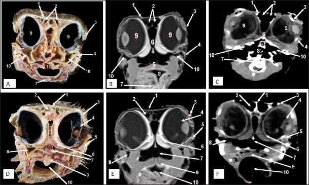 Fig. 8. Rostral-caudal cross sections of the adult ostrich head—level 3. Rostral views of A) photograph of an anatomical cross section, B) MRI and computed tomography images showing: 1- Os nasalis, 2- Frontal sinus (divided by septea), 3- Lateral nasal process, 4-Os jugalis, 5- Vomer (pneumatic), 6- Nasal septum (two ridges separated by an empty groove), 7- Laryngeal cartilage, 8- Laryngeal cavity, 9- Eye ball, 10- Infra orbital sinus, 11- Choanae. Caudal view of D) an anatomical section, E) MRI and F) computed tomography images showing: 1- Os nasalis, 2- Frontal sinus, 3- Lateral nasal process, 4- Eye ball, 5- Os jugalis, 6- Pars verticalis ethmoidale, 7- Vomer, 8- Infra orbital sinus, 9-Latyngeal cartilage, 10- Tracheal lumen surrounded by tracheal cartilaginous rings.