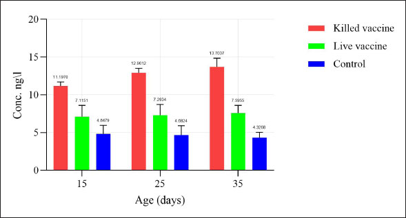 AbstractBackground: Newcastle disease virus is a virus that causes a significant economic impact on the poultry industry and is primarily controlled through vaccination. Most of the vaccinations with the LaSota strain are either live attenuated or inactivated vaccines, both of which are from the Lentogenic pathotype. Aim: This study aimed to investigate the influence of vaccine type and genetic variations on Chicken Interleukin-4 (ChIL4) activation. Methods: Three groups were examined: Group K received the killed vaccine, Group L received the live vaccine, and Group C served as the control. Blood samples were collected on days 15, 25, and 35 post-vaccinations to assess ChIL4 levels using Enzyme-Linked Immunosorbent Assay and for molecular analysis using polymerase chain reaction. Results: Group K showed a gradual increase in ChIL4 levels from 11.19 ± 0.17 to 13.70 ± 0.38, while Group L exhibited an initial increase on day 15 followed by stabilization on days 25 and 35. In contrast, ChIL4 levels in Group C declined over time from 4.84 ± 0.39 to 4.32 ± 0.25. Molecular analysis revealed four genetic variations of the single nucleotide polymorphism (SNPs) type at locations (3044, 3132, 3261, 3499) bp, with the third SNP at location (3261 bp) resulting in an amino acid change from valine to isoleucine. Analysis indicated that variants for most of these SNPs occur more likely in Group K compared to the other two groups. Conclusion: These findings suggest that genetic variations, particularly SNPs, may play a significant role in ChIL4 activation, potentially impacting vaccine efficacy and immune response. Keywords: Single nucleotide polymorphism, Cytokine, PCR technique. IntroductionNewcastle disease (ND) is an acute and highly contagious viral disease with elevated pathogenicity that affects the respiratory, digestive, and nervous systems of poultry at all ages, resulting in significant consequences for the economy (Al-Azawy et al., 2019). The Newcastle disease virus (NDV) is avian orthoavulavirus-1 (also known as avian paramyxovirus serotype-1), which is a member of the paramyxoviridae virus family and the Avulavirinae subfamily belonging to the Mononegavirales order. The viruses of this subfamily have been isolated from a variety of bird species (Gogoi et al., 2015; Ahmed and Odisho, 2019; Hassan et al., 2020). NDV is classified into five pathotypes based on the strain’s pathogenicity: Asymptomatic enteric strains include lentogenic, mesogenic, viscerotropic, and neurotropic velogenic strains. An infection with the velogenic NDV pathotype can result in neurological symptoms and significant mortality in chickens (Ulaiwi, 2023). The virus strain, as well as flock management, concomitant illnesses, and acquired immunity from previous paramyxovirus infections, all influence clinical symptoms (Ahmed et al., 2018). The viral form of NDV is pleomorphic. It is an enveloped, single-stranded, non-segmented negative-sense RNA virus with a length of about 15 kb. The genome encoded six structural proteins, including large RNA-dependent polymerase protein (L), phosphoprotein (P), fusion protein (F), matrix protein (M), nucleocapsid protein, and hemagglutinin-neuraminidase, as well as two additional non-structural proteins (W and V) that were produced in the P gene during mRNA transcription (Kapczynski et al., 2013; Al-Zuhariy et al., 2017). Several direct and indirect diagnostic procedures are used to identify NDV, including the hemagglutination inhibition test, serum neutralization test, Enzyme-Linked Immunosorbent Assay (ELISA) test, and polymerase chain reaction (PCR) (Al-Amri et al., 2015; Shauqi and Omran, 2019). In general, PCR is a powerful tool for both direct and indirect diagnosis of viruses (Jumaa et al., 2020; Jbr and Jumaa, 2024). Poultry flocks inoculated against NDV have a strong defense against pathogenic strains. It is well known that live attenuated vaccines produce an average to moderate immune response, are inexpensive, and are simple to deliver. ND vaccination has been approved for use in a number of countries throughout the world, and it is available in live, inactivated, and attenuated forms. Vaccination with LaSota strain is usually of Lentogenic pathotype (live attenuated or inactivated) (Mayers et al., 2017). Chicken Interleukin-4 (ChIL-4) is a cytokine that is a strong immune regulator released largely by mast cells, activated Th2 cells, eosinophils, and basophils. It is a critical regulator of humoral and adaptive immunity when faced with extracellular pathogens and helminth parasite infections (Gadani et al., 2012; Dai et al., 2018). It has been shown to be the first Cytokine produced by mast cells during an immune response (McLeod et al., 2015). ChIL-4 plays a role in type 2 immune response, along with the other signature cytokines IL-5, IL-9, and IL-13, and in the development of Allergic reactions (Sahoo et al., 2016). Materials and MethodsExperimental animals and designOne-day-old chicks (Gallus gallus domesticus) were kept in the animal houseCollage of Veterinary MedicineUniversity of Baghdad for the duration of the experiment in a disinfected room. The room was divided into sections to accommodate the three groups. It was then fumigated with the floor bedding using an environmental disinfectant. The temperature was maintained at 33°C for the first 2–3 days and then was stabilized at 36°C using heaters and air fans. Sixty chicks were divided into three groups with 20 chicks in each one: Group 1 (K) was vaccinated Intramuscularly with inactivated Newcastle vaccine La Sota strain on the second day of the experiment. Group 2 (L) was vaccinated via ocular installation with live attenuated Newcastle vaccineLa Sota strain on days 10, 20, and 30. Group 3 (C) served as a control group. Whole blood and serum samples were collected from all groups on days 15, 25, and 35 of the experiment to measure ChIL-4 levels and for molecular analysis. Enzyme-linked immunosorbent assay