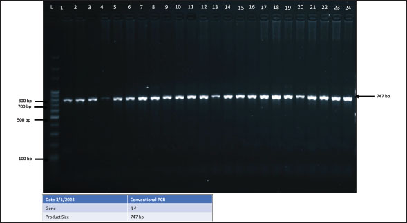 Statistical analysisThe GraphPad Prism software version 10.2.2 (San Diego, CA, United States) was used to statistically analyze the obtained data by Two-way ANOVA. Whenever ANOVA results were significant, post hoc analysis was performed using Tukey’s test. Number of animals represented by (n). Data are presented as mean ± standard error. Statistically significant was accepted when (p < 0.05) (Kim, 2014). Odds ratios were calculated using a free online calculator (MedCalc). Ethical approvalThe Experimental Design and Protocols used in the Current Study were reviewed and approved in accordance with the Animal Welfare Ethical. Measures by the Scientific Committee of the Department of Veterinary Microbiology, College of Veterinary Medicine, University of Baghdad, Baghdad, Iraq (p.o.3052024212). ResultsChIL4 levelsThe results demonstrated in Table 3 and Figure 1 indicated Group (K) had a gradual increase in ChIL-4 levels from 11.19 ± 0.17 on day 15 to 13.70 ± 0.38 on day 35. while group L exhibited a significant increase on day 15, this increase plateaued during subsequent observations, yet it still had higher levels than group C, which exhibited a significant decrease (p ˂ 0.05), with the lowest among the three groups being on day 35 at 4.32 ± 0.25. Molecular detectionGel electrophoresis showed bands of amplified DNA for the ChIL-4 gene as exhibited in Figure 2: SequencingSequence analysis indicated the presence of four genetic variants of the single-nucleotide polymorphism (SNPs) type (Fig. 3) within the area that was amplified. These variants were detected at locations 3044, 3132, 3261, and 3499 bp. Three of these are in the non-coding region, while site 3261 bp was in a coding region where in the instances where a homozygous mutant was demonstrated, the amino acid was changed from valine (Val) to isoleucine (Ile). Genotypically, Group K indicated the highest percentage of homozygous mutations at locations 3044, 3132, and 3261 bp. While Group L had the highest percentage of heterozygous mutations at locations 3044 and 3261 bp. The control group had the highest heterozygous mutant at 3132 bp and the highest homozygous wild at 3499 bp as shown in Table 4. The allele frequency in Group K had the highest percentage of mutant alleles at sites 3044 and 3132 bp. Group L had the highest percentage at site 3499 bp and the highest wild allele at site 3261 bp. The control group had the highest mutant allele at site 3261 bp and the highest wild allele at site 3132 bp which is demonstrated in Table 5. Sequencing results indicated that the alteration in the genotype in the first three locations (3044 A>G, 3132 G>A, 3261 G>A) occurred more likely in Group K compared with the other two groups, as shown in the odds ratio values in Table 4 this alteration in genotype resulted in an increase in the levels of Interleukin-4 that is produced. The last location (3499 G>A) indicated that the increase in Interleukin-4 happens more likely in group K than in group L (OR=0.843). The allele alteration at the first two locations (3044 A>G, 3132 G>A) highlighted similar results to the alteration in the genotype. Table 3. Mean ± S.E of ChIL4 titer of serum in ELISA test.