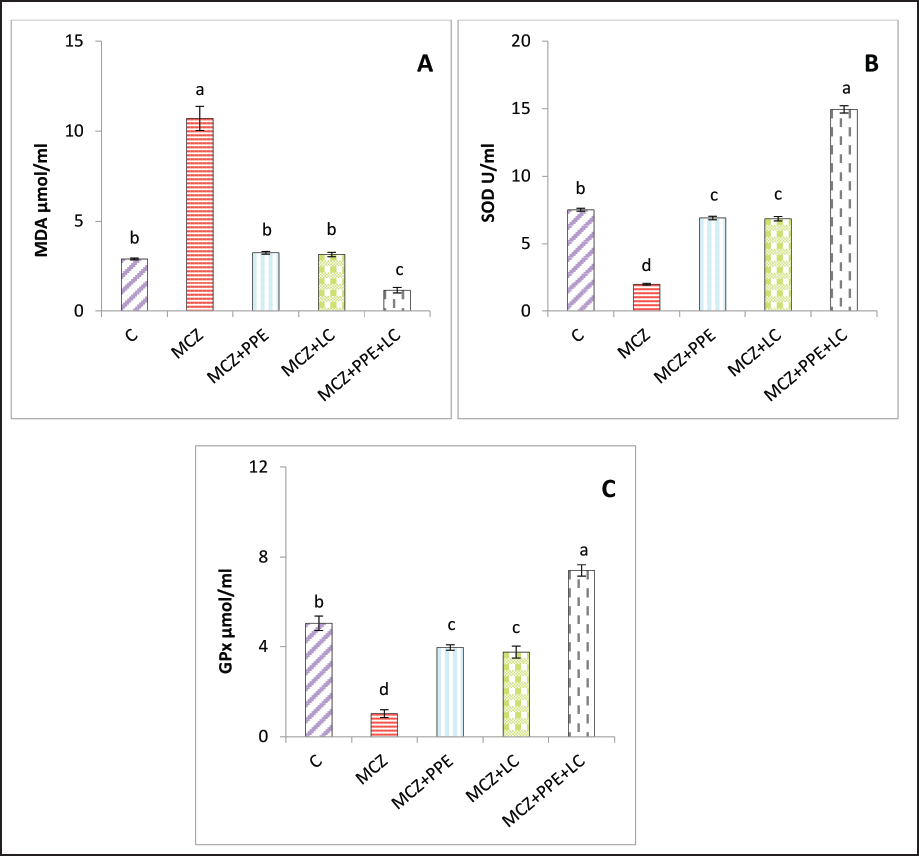 Fig. 1. Serum oxidative stress and antioxidant markers in rats. (A) MDA: malondialdehyde, (B) SOD: superoxide dismutase; (C) GPx: glutathione peroxidase. The different letters represent significant differences among groups at p < 0.05. C: control rats received distilled water, MCZ: rats received (313.6 mg/Kg/day) of mancozeb. MCZ+PPE: rats received (313.6 mg/Kg/day) of mancozeb and (40 mg/Kg/day) of Pinus pinaster extract. MCZ+LC: rats received (313.6 mg/Kg/day) of mancozeb and (200 mg/Kg/day) of L. carnitine. MCZ+PPE+LC: rats received (313.6 mg/Kg/day) of mancozeb, (40 mg/Kg/day) of Pinus pinaster extract, and (200 mg/Kg/day) of L. carnitine. Ethical approvalThe ethical scientific committee of Al-Qasim Green University/Veterinary Medicine approved the current experiment, ensuring proper care and use of laboratory animals (ESCVM, NO. 1872023.). ResultsComparative effects of P. pinaster Extract and L. carnitine on serum concentrations of oxidative stress and antioxidant markers against Mancozeb-induced reprorotoxicity in adult male ratsThe concentration of serum MDA was significantly elevated (p < 0.05) in MCZ rats compared with all experimental groups, Figure 1A. It was significantly decreased (p < 0.05) in the MCZ + PPE + LC group compared with the other experimental rats. The serum MDA concentration was significantly decreased (p < 0.05) in the MCZ+PPE and the MCZ+LC groups compared with the MCZ group, with non-significant differences (p > 0.05) among the MCZ+PPE, MCZ+LC, and control groups, Figure 1A. The serum concentration of superoxide dismutase, SOD, was significantly reduced (p < 0.05) in MCZ rats and elevated (p < 0.05) in MCZ+PPE+LC rats compared with all treatment groups, Figure 1B. The serum concentration of SOD was significantly increased (p < 0.05) in MCZ+PPE and the MCZ+LC groups compared with MCZ rats, with non-significant differences (p > 0.05) between the aforementioned groups, Figure 1B. The serum concentration of GPx was significantly decreased (p < 0.05) in the MCZ group and increased (p < 0.05) in the MCZ+PPE+LC group compared with all treatment groups, Figure 1C. The GPx concentration showed a significant increase (p < 0.05) in the MCZ+PPE and the MCZ+LC groups in comparison with MCZ rats, with non-significant differences (p > 0.05) among the MCZ+PPE, MCZ+LC, and control groups, Figure 1C. Comparative effects of P. pinaster Extract and L. carnitine on serum concentrations of male reproductive hormones and testicular genes in response to mancozeb-induced reprotoxicity in adult male ratsReproductive hormones The serum concentrations of LH, FSH, and testosterone are shown in Figure (2 A, B, and C, respectively). The serum testosterone, FSH, and LH levels were significantly decreased in the rats that received MCZ only compared with the experimental groups, Figure 2. The concentrations of FSH, LH, and testosterone in the MCZ+PPE+LC rats were significantly increased (p < 0.05) compared with all treatment groups, Figure 2. In comparison with the MCZ group, the concentrations of LH, FSH, and testosterone were significantly increased (p < 0.05) in the MCZ+PPE group and the MCZ+LC group, Figure (2 A, B, and C). The serum levels of testosterone, LH, and FSH in the MCZ+LC rats and the MCZ+PPE rats showed a significant decrement (p < 0.05) in comparison with the control group, with non-significant variation (p > 0.05) between both groups concerning LH and testosterone concentrations, Figure 2. Testicular genes The testicular gene expression levels of the luteinizing hormone-β receptor (LHβr) and follicle-stimulating hormone-β receptor (FSHβr) were significantly downregulated (p < 0.05) in mancozeb-exposed rats compared with all experimental groups, Figure 3. Interestingly, the cotreatment of P. pinaster extract with L. carnitine rats caused significant (p < 0.05) enhancement and upregulation of the testicular FSHβr, and LHβr gene expression levels compared with all experimental groups. The current results registered a significant (p < 0.05) upregulation in mancozeb co-administration of P. pinaster extract rats and in mancozeb-co-exposed to L. carnitine rats compared with mancozeb-treated male rats, whereas non-significant (p > 0.05) differences were observed among the MCZ+PPE, MCZ+LC, and control groups, Figure 3.