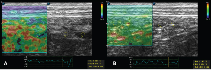 Fig. 3. Semiquantitative cross-sectional deformation elastography of the intestine of a dog with intestinal lymphangiectasia. The SR was obtained by evaluating ROI 1 of the mesenteric and ROI 2 of the dorsal region of the intestinal segment. A duodenum with an SR of 2.58 B-Jejunum with an SR of 1.97 Based on the obtained information, the definitive diagnosis was primary intestinal lymphangiectasia. As a result, a low-fat diet was prescribed (Gastrointestinal low fat, Royal Canin®, Descalvado, São Paulo, SP, Brazil), prednisolone (Predsim®, Mantecorp Farmasa, São Paulo, SP, Brazil) 1 mg/kg orally every 24 hours, chlorambucil (Leukeran®, Aspen Pharma, Rio de Janeiro, RJ, Brazil) 4 mg/m2 orally every 48 hours, and clopidogrel (Manipulado®, Drogavet, Goiânia, GO, Brazil) 1 mg/kg every 24 hours. After 30 days of treatment, there were no more laboratory changes (Table 2), the CCECAI was reduced to four (Table 1), and the patient no longer had diarrhea and gained weight. In addition, hyperechogenicity of the intestinal mucosa was reduced, and the values for elastography of the duodenum were as follows: ROI 1 1.61 % and ROI 0.99 %, with an SR of 1.62 (Fig. 5A). In the jejunum, ROI 1 measured 0.29 %, ROI 0.25%, and SR 1.14 (Fig. 5B). The drugs were withdrawn, and only the corticosteroid, which was reduced to 0.5 mg/kg every 24 hours, was administered. Follow-up was recommended every 2 months and, in cases of recurrence, clinical treatment. DiscussionAfter clinical, laboratory, and dietary screening, the patient was diagnosed with intestinal lymphangiectasia. This result corroborates a recent classification of canine chronic enteropathy, which included intestinal inflammation associated with protein loss (Dupouy-Manescau et al., 2024). The authors believe that this type of enteropathy can be further fragmented into diet-responsive, immunosuppressant-responsive, and non-responsive. We believe that the animals described in this report have immunosuppressant-responsive disease even though the treatment protocol included a low-fat diet. However, we recognize that this case report describes a short period of therapeutic intervention that does not allow differentiation of the type of protein-losing enteropathy (PLE).