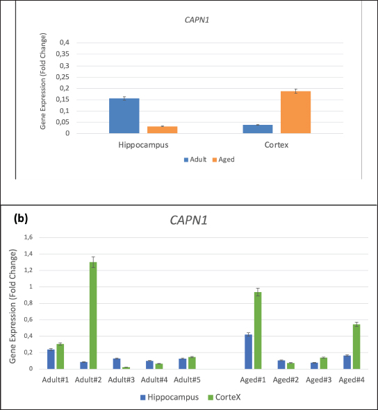 Fig. 1. Gene expression of CAPN1 in the hippocampus and cortex of adult and aged cynomolgus monkeys (a) Group gene expression (b) Individual gene expression. Values are presented as means error bars=SEM.