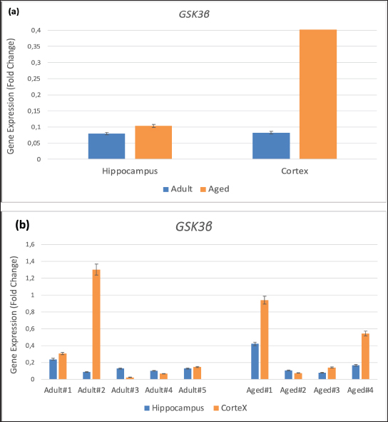 Fig. 2. Gene expression of GSK3β in brain hippocampus and cortex of adult monkeys compared with aged monkeys. (a) Group gene expression. (b) Individual gene expression. Values are presented as means error bars=SEM. DiscussionThe accumulation of phosphorylated tau proteins in neurofibrillary tangles in the brain is closely linked to neuronal loss and cognitive function in AD. Tau phosphorylation is regulated by genes including CAPN1, CDK5R1, and GSK3β (Park et al., 2015; Spreafico et al., 2018; Lauretti and Dincer, 2021), and in the present study, the cortical regions of older monkeys (aged) exhibited higher levels of gene expression compared with the cortical regions of younger monkeys (adult). The aging process involves a complex interplay of genetic, epigenetic, and environmental factors that lead to changes in gene expression. The increased expression of CAPN1, CDK5R1, and GSK3β may be part of a broader pattern of altered gene regulation in aging neurons. These changes could be driven by factors such as increased inflammatory signals, altered growth factor levels, and changes in cellular metabolism. Neurons become more susceptible to damage and degeneration as they age. The increased expression of these genes may be associated with early neurodegenerative changes, even in the absence of overt disease. This upregulation may reflect an attempt to cope with accumulating damage, but it may also contribute to a pathological cycle of tau phosphorylation and neuronal dysfunction.