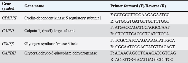 Open Vet. J.. 2025; 15(3): 1150-1156 Open Veterinary Journal, (2025), Vol. 15(3): 1150-1156 Research Article Expression profiles of the Tau-associated genes GSk3β, CAPN1, and CDK5R1 in the brain cortex of aged female cynomolgus monkeys with cognitive impairmentHuda S. Darusman1,2,3*, Lis Rosmanah1,3, Sela S. Mariya4, Uus Saepuloh1, Yuliana Yuliana1 and Jann Hau51Primate Research Center, Institute of Research and Community Service, Bogor Agricultural University (IPB University), Bogor, Indonesia 2School of Veterinary Medicine and Biomedical Sciences, IPB University, Bogor, Indonesia 3Primatology Graduate Study Program, IPB University Graduate School, Bogor, Indonesia 4Center for Biomedical Research, National Research and Innovation Agency (BRIN), Cibinong, Indonesia 5Department of Experimental Medicine, Faculty of Health and Medical Sciences, University of Copenhagen, Copenhagen, Denmark *Corresponding Author: Huda S. Darusman. School of Veterinary Medicine and Biomedical Sciences, IPB University, Bogor, West Java, Indonesia. Email: hudada [at] apps.ipb.ac.id Submitted: 12/11/2024 Accepted: 06/02/2025 Published: 31/03/2025 © 2025 Open Veterinary Journal