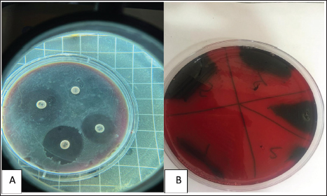 Fig. 1. (A) Antimicrobial susceptibility of Streptococcus isolates on modified Muller-Hinton agar. (B) Streptococcal isolates were cultured in Congo red medium. It is evident that certain antibiotics, such as Tigecycline and Amikacin, show varying degrees of effectiveness against different species, whereas others, like Imipenem and Lincomycin, exhibit consistent resistance across all strains (Tables 2, 4, and 5). DiscussionMozzarella cheese is made specifically from buffalo milk, in addition to other types of animal milk (Araujo et al., 2012). According to Ammin et al. (2024) study, Streptococcus agalactiae and Streptococcus pyogenes were identified as the primary Streptococcus species responsible for pharyngitis in children, with prevalence rates of 24% and 18%, respectively, the research also highlighted the variation in bacterial species distribution based on the patients’ ages. Furthermore, antibiotic sensitivity testing revealed intriguing results; Streptococcus pneumoniae and Streptococcus parasanguinis exhibited high sensitivity to multiple antibiotics, whereas S. pyogenes demonstrated resistance to Metronidazole and Azithromycin (Ammin et al., 2024). Vásquez-García et al. (2017) found isolation from milk buffalo were 11(5.5%). Morea et al. (1999) and Al-Khafaji et al. (2013) examined cheese to investigate the dominant bacteria for the detection of potential pathogens in raw milk-derived unripe cheese. They identified Streptococcus uberis along with other species such as Corynebacterium, Streptococcus, Enterococcus, Staphylococcus, Leuconostoc, and Lactococcus. In Baghdad–Iraq, the first case of vancomycin resistance in raw milk was reported by Al Marjani et al. (2016). The results of sensitivity to vancomycin (25%) were accepted by o Vásquez-García et al. (2017) and noncompatible (12.5%) for penicillin. Bhardwaj et al. (2018) found in India beta-hemolytic Streptococci less resistant to ciprofloxacin (21, 9.5%). On the other hand, all isolates of Enterococcus faecalis in crude milk and imported milk powders at Baghdad markets are resistant to vancomycin (Al-Shammary, 2019). Antimicrobial resistance in Streptococci from animals can differ significantly based on the specific Streptococcal type, so it should not be considered a single entity (Haenni et al., 2018). Antibiotic treatment plays a critical role in managing mastitis infections. Understanding the prevalence of antibiotic resistance and the susceptibility of microorganisms isolated from infected cow milk could improve mastitis treatment strategies. Thus, infection treatment with intramammary antibiotics begins before microbiological culture (Wongkattiya, 2008; Kanaan and AL-Shammary, 2013; Muruzović et al., 2018).