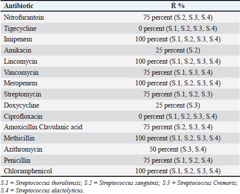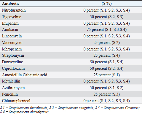 Table 4. Percentage of antibiotic sensitivity to Streptococcus species.