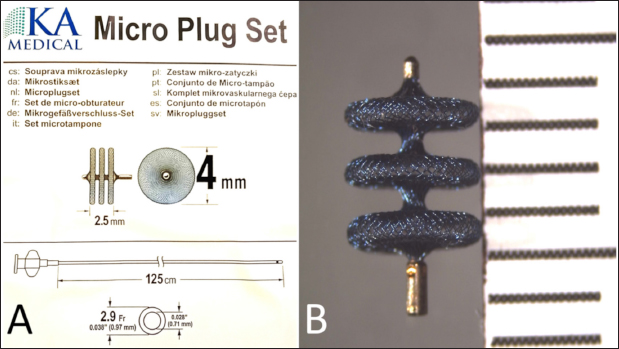 Fig. 1. Schematic drawing of the KA Micro Plug Set with the device and 2.9-French delivery catheter, along with the relevant sizes (A), and a photograph of the device (B) with a millimeter scale.