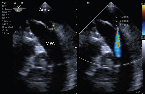 Fig. 3. Intraoperative TEE showing PDA and its measurements (MDD: 1.2 mm; ampulla diameter: 3.8 mm; length: 4.4 mm) and the flow from the aorta to the pulmonary artery (MPA) on CFM Doppler (Dual-mode).