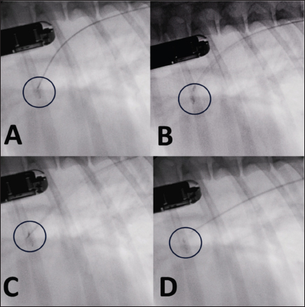 Fig. 4. Fluoroscopic sequence. (A) The first disc is deployed and the entire system is retracted until it engages the pulmonary ostium. (B) The second and third discs are released into the ampulla. (C) The device is released with anticlockwise rotation of the delivery cable. (D) The delivery catheter is removed along with the delivery cable.