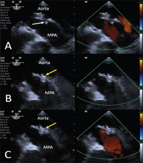 Fig. 5. Intraoperative TEE. (A) The first disc is released into the pulmonary artery (yellow arrowhead). (B) The central and proximal discs are positioned inside the ampulla (yellow arrowhead). (C) No residual flow is visible on CFM (Dual-mode) examination, and no flow obstacles are present in the pulmonary artery. Subsequently, the guidewire (reinserted into the catheter) and catheter were passed under fluoroscopic and transthoracic echocardiography guidance through the PDA into the pulmonary trunk in an anterograde manner until the tip of the guidewire was clearly visible in the pulmonary artery. The catheter was then removed, leaving the guidewire, on which the dedicated 2.9-French KA manufacturer microcatheter was positioned such that its tip was clearly visible under both fluoroscopic and TEE guidance, in situ. The guidewire was subsequently removed. To facilitate the operations and avoid a mismatch with the length (180 cm) of the 0.0025” guidewire, given the length of the microcatheter (125 cm), its tip was shortened by 40 cm. The device, in its loader, was inserted into the delivery sheath through the appropriate Tuohy-Borst Sidearm Adapter provided by the manufacturer and was advanced carefully until the distal disc was expanded in the pulmonary artery. The delivery wire and catheter were gently withdrawn until resistance was experienced in the pulmonary ostium. The guiding sheath was then retracted, allowing expansion of the central and proximal discs of the device within the PDA ampulla. The stability of the device was subsequently tested with the push–pull “Minnesota wiggle” maneuver, and the cessation of transductal flow and the correct positioning of the device was verified using TEE (Figs. 4 and 5). The device was then deployed by rotating the delivery cable counterclockwise with the appropriate plastic vise. To verify the closure of the PDA and the absence of protrusions in the aorta further, a second angiography was performed as before (Fig. 6).