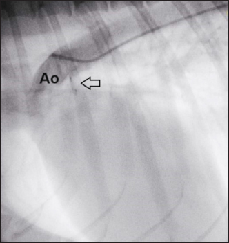 Fig. 6. Angiography conducted after device (arrow) release. The PDA is completely occluded and no residual shunt is visible. The delivery sheath and introducer sheath were then removed, the femoral artery was ligated, and the surgical wound was repaired in a routine manner using a 3-0 monofilament polydioxanone absorbable suture (PDS* II Ethicon, Raritan, NJ). The duration of the entire surgery was 40 minutes, with fluoroscopic exposure times of 3 minutes 40 seconds. Recovery from anesthesia was uneventful, and the dog was able to walk and eat 3 hours later. Thoracic radiographs after 24 hours showed correct positioning of the device (Fig. 7). The dog was discharged, and a check-up was scheduled for 30 days. The 1-month TTE echocardiographic examination confirmed complete occlusion of the PDA, without residual shunting on Color Flow Mapping (CFM), correct positioning of the device, with complete reverse remodeling of the cardiac chambers (Fig. 8). Ethical approvalEthics review and approval of this study were waived because this was not an experimental study, but a clinical report of a spontaneously occurring congenital disease, and detailed informed consent was obtained from the owner for the publication of the images and clinical case.