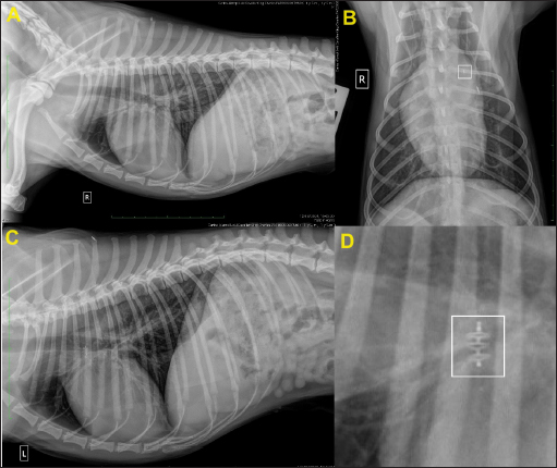 Fig. 7. Thoracic radiographs obtained 24 hours after surgery. (A) Right lateral, (B) dorso-ventral, (C) left lateral views, and (D) close-up view of the device in the right lateral view (white square). In (B), note the thickness of the device (white square) compared to that of the identification microchip. Post-operative films show that the device is positioned correctly.