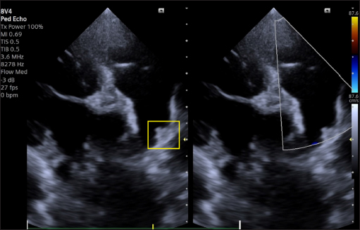 Fig. 8. Dual-mode transthoracic echocardiography (left cranial parasternal view optimized for duct visualization) at 30 days after surgery. The device (yellow square) is correctly positioned, and no evidence of residual shunt or pulmonary arterial obstruction is present on CFM Doppler. DiscussionOur case report details the first use of a KA Micro Plug Set via the transarterial approach for occluding a PDA in a small young dog. In human medicine, this device has been used in a few dozen neonates and infants undergoing transcatheter PDA occlusion via transvenous access only (Heyden et al., 2020, Guyon et al., 2022). Veterinary and human cardiologists have previously reported successful closure of PDAs in small dogs and children with the AVP4 and transarterial (Hogan, et al., 2021, Hulsman et al., 2021) or tranvenous access (Mini et al., 2023). However, the available lengths of the AVP4 (10–13.5-mm, unconstrained) make it potentially suitable only for long ducts. In the case of short ducts, the plug may protrude into the aorta or into the pulmonary artery, leading to stenosis (Mini et al., 2023). In veterinary medicine, the AVP4 is delivered through a 4-French angiographic catheter through the femoral artery, without the use of an introducer with a hemostatic valve, which poses a potential risk of bleeding, which can have a marked clinical impact in small dogs. The Micro Plug Set addresses the limitations of contemporary devices used for transcatheter PDA closure in small dogs, even those with a small-diameter femoral artery. First, this device is shorter (2.5 mm), which allows the closure of ducts much shorter than 10 mm, without any risk of protrusion and stenosis, and the shape is well suited for placing the distal disc in the pulmonary artery and the central and proximal discs of the device within the PDA ampulla, potentially reducing the risk of embolization. Second, the device is delivered through a soft, low-profile (2.9-French) microcatheter. It does not require catheter exchange, a stiff delivery catheter, a sheath, or a guide wire, and can easily be introduced through a 4-French introducer with a hemostatic valve. The device is available with disc diameters of 3, 4, 5, and 6 mm, and based on the experience in human medicine and in our canine clinical case, the diameter of the selected disc must be >2 mm larger than the MDD and should be similar to that of the mediodistal part of the ampulla closest to the pulmonary side, allowing occlusion of PDAs even of significant dimensions. Therefore, the Micro Plug Set appears to be a promising transcatheter device for use in small dogs that addresses the limitations of the currently available devices. Our first experience has shown that the device can be safely implanted, with no significant procedural complications or adverse events. The only critical issue noted in our study was the poor radiopacity and lower visibility of the device by fluoroscopy, due to its small size, relative to that of other devices. Intraprocedural monitoring with TEE provides useful support, in addition to shortening the exposure time to X-rays for operators and patients. In very small patients in whom the size of the probe does not allow TEE examination, we believe that TTE monitoring coupled with fluoroscopy could be very useful, as is used in very small, premature human infants (Heyden et al., 2020, Catalán et al., 2024). Our success, albeit in a single dog, demonstrated that the Micro Plug Set is a promising transcatheter device option for transarterial PDA occlusion in small dogs. More clinical cases are required, and its use via transvenous access in dogs, such as those used in children, is desirable. Finally, our report provides cardiologists, both veterinary and human, with a novel method of transvascular PDA occlusion in small dogs and potentially in children and demonstrates how the mutual exchange of information in the field of veterinary and human interventional cardiology can contribute to significant progress in addressing challenging clinical cases. AcknowledgementsThe authors thank Dr Altin Cala for his helpful suggestions in drafting the manuscript. Conflict of interestThe authors have no conflicts of interest to declare. No funding was received for the authors of this case report. FundingThe authors declare that there is no conflict of interest. No funding was received by the authors for this case report. Authors’ contributionsVenco L, Leca F Conceptualization and surgical management. S.A.Geanta Diagnosis, TEE management, and follow up. M.C. Bolintineanu surgical management A. Nechifor Anesthesia management. Venco L.: Manuscript supervision. All the authors manuscript drafting and approval of the final manuscript Data availabilityAll data supporting the findings of this study are available within the manuscript. ReferencesBagardi, M., Domenech, O., Vezzosi, T., Marchesotti, F., Bini, M., Patata, V., Croce, M., Valenti, V. and Venco, L. 2022. Transjugular patent ductus arteriosus occlusion in seven dogs using the Amplatzer vascular plug II. Vet. Sci. 9(8), 431. Belachsen, O., Sargent, J., Koffas, H., Schneider, M. and Wagner, T. 2022. The use of Amplatzer vascular plug II in 32 consecutive dogs for transvenous occlusion of patent ductus arteriosus. J. Vet. Cardiol. 41, 88–98. Blossom, J.E., Bright, J.M. and Griffiths, L.G. 2010. Transvenous occlusion of patent ductus arteriosus in 56 consecutive dogs. J. Vet. Cardiol. 12(2), 75–84. Brambilla, P.G., Polli, M., Pradelli, D., Papa, M., Rizzi, R., Bagardi, M. and Bussadori, C. 2020. Epidemiological study of congenital heart diseases in dogs: prevalence, popularity, and volatility throughout twenty years of clinical practice. PLoS One. 15(7), e0230160. Buchanan, J.W. 1994. Patent ductus arteriosus. Semin. Vet. Med. Surg. 9, 168–176. Cala, A., Ferasin, L., Ferasin, H., Domenech, O., Bini, M., Valenti, V. and Venco, L. 2024. Transvenous closure of patent ductus arteriosus with Nit-Occlud® PDA