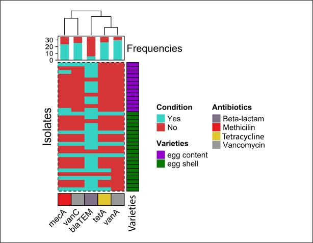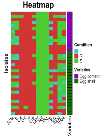 Fig. 2. The heatmap represents the distribution of the different types of antibiotic-resistant genes of Staphylococcus aureus isolated from eggshells and contents. Here, the top of the dendrogram represents the frequency of present genes and the neighborhood relationship among the genes. These resistance and sensitivity patterns were further supported by strong and statistically significant positive associations observed between several antibiotics in the correlation analysis. Notably, AZM showed strong correlations with E (Pearson correlation coefficient, p=0.826), TE (p=0.826), GEN (p =0.586), and VAN (p=0.539). This finding aligns with the observed resistance trends, in which E and TE displayed notable resistance levels, whereas GEN and VAN showed lower resistance. Similarly, E was strongly correlated with CIP (p=0.471), a fluoroquinolone that exhibited both high resistance and low sensitivity, as well as CD (p=0.795), reflecting the resistance trends in lincosamide. Further strong associations were noted between E and TE (p=1.000), CIP and TE (p=0.471), E and GEN (p=0.484), TE and GEN (p=0.484), E and VAN (p=0.612), TE and VAN (p=0.612), and GEN and VAN (p=0.791). These correlations underscore the complex relationship between resistance patterns and antibiotic effectiveness, particularly among macrolides, aminoglycosides, and glycopeptides (Table 7). Antibiotic susceptibility testing of S. aureus isolated from egg contentsThirteen coagulase-positive S. aureus isolates from table egg contents were tested for antibiotic susceptibility. The higher resistance levels were observed to β-lactam antibiotics, including P (100%) and OX (100%), cephalosporins such as CX (92%), lincosamides such as CD (84%), fluoroquinolones such as CIP (69%), and tetracyclines, specifically TE (61%). Additionally, 30% of the isolates showed resistance to macrolides (E) and aminoglycosides (GEN), whereas 46% were resistant to VAN. Among the egg content isolates, all (100%) were sensitive to LEV and DO, with NX and GEN showing sensitivity in 92% and 69% of the isolates, respectively. Sensitivity to E and VAN was observed in 38% of the isolates. The lowest sensitivity rates were observed for CX and TE, with only 7% of the isolates responding to these antibiotics (Table 6 and Fig. 4). These resistance and sensitivity patterns align with the statistical findings of the bivariate analysis, in which strong and positive significant correlations were observed between several antibiotics. In this study, AZM was strongly correlated with E (p=0.033, coefficient=0.592), GEN (p=0.001, coefficient=0.822), and VAN (p=0.033, coefficient=0.592). These correlations reflect the observed resistance trends, particularly in the case of E, GEN, and VAN, in which resistance was noted in 30% and 46% of the isolates, respectively.