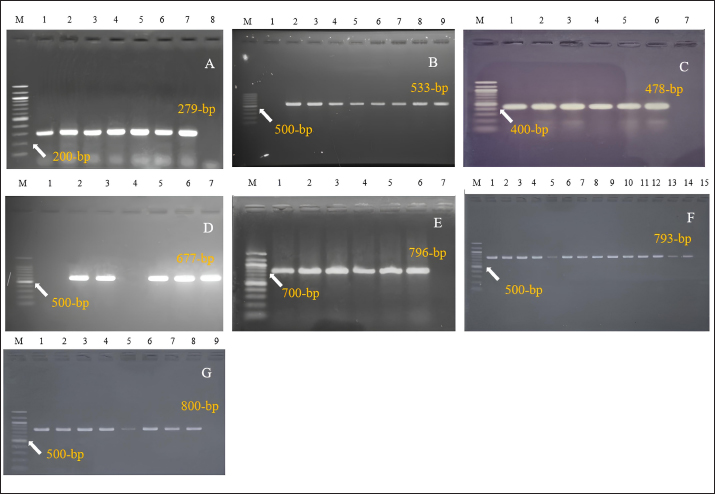 Fig. 3. PCR detection of Staphylococcus aureus. (A) Amplification of 279-bp fragment of nuc gene (Lane 1–6: DNA samples, Lane M: 100-bp size DNA marker, Lane 7: positive control, and Lane 8: negative control) of S. aureus. (B) Amplification of 533-bp fragment of mecA gene (Lane 2–8: DNA samples, Lane M: 100-bp size DNA marker, Lane 9: positive control, and Lane 1: negative control) of S. aureus. (C) Amplification of 478-bp fragment of seb gene. (Lane 1–5: DNA samples, Lane M: 100-bp size DNA marker, Lane 6: positive control, and Lane 7: negative control) of S. aureus (D) Amplification of 677-bp fragment of vanA gene (Lane 2, 3, 5, and 6: DNA samples, Lane M: 100-bp size DNA marker, Lane 7: positive control, and Lane 4: negative control) of S. aureus. (E) Amplification of 796-bp fragment of vanC gene (Lane 1–5: DNA samples, Lane M: 100-bp size DNA marker, Lane 6: positive control, and Lane 7: negative control) of S. aureus. (F) Amplification of 793-bp fragment of blaTEM gene (Lane 1–13: DNA samples, Lane M: 100-bp size DNA marker, Lane 14: positive control, and Lane 15: negative control) of S. aureus. (G) Amplification of 800-bp fragment of tetA gene (Lane 1–7: DNA samples, Lane M: 100-bp size DNA marker, Lane 8: positive control, and Lane 9: negative control) of S. aureus. Additionally, E exhibited strong correlations with CIP (p=0.025, coefficient=0.617), TE (p=0.004, coefficient=0.732), and VAN (p=1.000, coefficient=1.000), supporting the resistance trends observed for these antibiotics. The correlation between E and CIP, for instance, is consistent with the moderate resistance levels observed for CIP (69%) and E (30%). Moreover, significant correlations between CIP and VAN (p=0.617, coefficient=0.617), TE and VAN (p=0.732, coefficient=0.732), and GEN and VAN (p=0.720, coefficient=0.720) underscore the observed patterns of resistance and sensitivity. The resistance observed in VAN (46%) is particularly notable in light of these correlations, which highlight the complex interplay between these antibiotics in egg content isolates (Table 8). Table 4. Molecular detection of enterotoxin and antibiotic resistance genes of Staphylococcus aureus isolated from eggshells and contents.