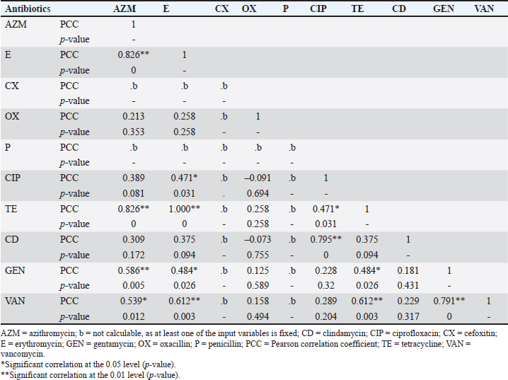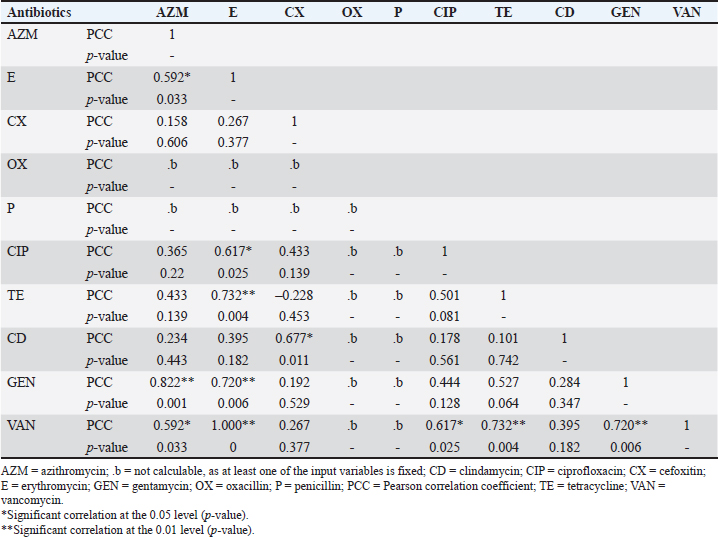 Previous studies have shown that bacteria can penetrate eggshells (Gole et al., 2014; Kulshreshtha et al., 2021). The widespread use of antibiotics in treating farm animals and in poultry feed may contribute to the presence of MRSA in eggs, facilitating the infection of eggs by resistant bacteria (Abreu et al., 2023). The current study aimed to detect S. aureus in egg samples collected from various retail sources to understand its prevalence, molecular characteristics, antimicrobial sensitivity, and MDR profile in Bangladesh. This research sheds light on how bacteria enter eggs, potentially through human or animal sources. The study found that Staphylococcus spp. were present in 53% of eggshell samples and 41% of egg contents. Among these, 21% of the eggshell isolates and 13% of the egg content isolates were confirmed as S. aureus. These findings emphasize the presence of potentially harmful bacteria in both the outer and inner parts of table eggs, underscoring the importance of good hygiene practices in egg production and consumption to ensure food safety and protect public health. Previous studies have indicated that bacteria, especially Staphylococcus spp., can be found on the outer shell of eggs (Verma et al., 2023). Punom et al. (2020) investigated unhatched leftover duck eggs from selected mini hatcheries in Kishoreganj, Bangladesh, and found a high prevalence of Salmonella spp., E. coli, Staphylococcus spp., and Clostridium spp. in unhatched leftover duck eggs. These bacterial species potentially contribute to decreased hatchability and increased embryo mortality. Pondit et al. (2018) also reported a high prevalence rate of S. aureus in chicken and quail eggshells in Mymensingh, Bangladesh. Table 8. Pearson correlation coefficient to assess the pairs of any of the two antibiotic-resistant Staphylococcus aureus isolated from table egg content samples.