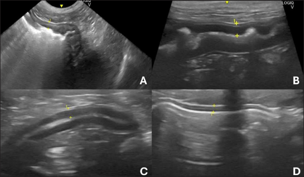 Fig. 1. Ultrasound images of the gastrointestinal tract of healthy dogs. A: gastric body, B: duodenum, C: jejunum, D: ileum. All segments with wall thickness were measured using a cursor in the ultrasound machine software. 8 MHz microconvex transducer.