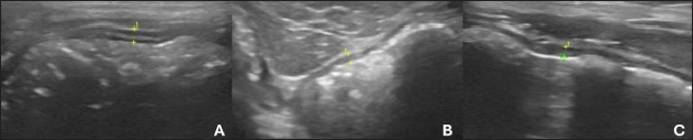 Fig. 2. Ultrasound images of the colon in healthy dogs. A, ascending colon; B, transverse colon; C, descending colon. All segments with wall thickness were measured using the ultrasound machine’s software cursor. An 8-MHz microconvex transducer was used, and longitudinal section images. Table 3. Intestinal ultrasound properties of dogs separated by region, anatomical location and specific characteristics.