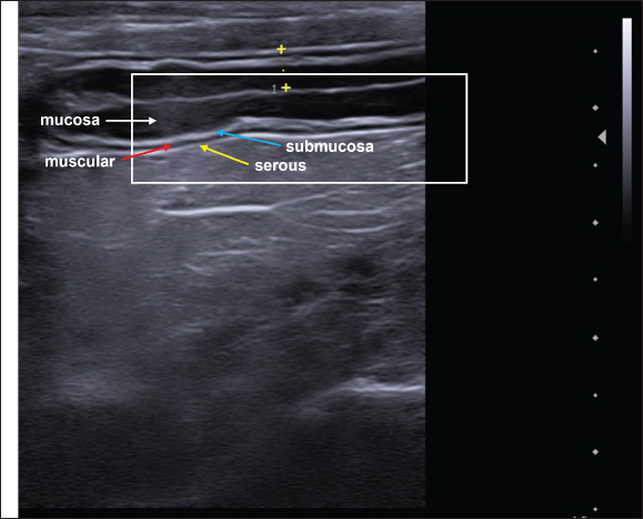 There is difficulty in scanning the colon due to the large amount of gas that is naturally present, plus the fecal material that is stored is an additive factor in the difficulty of evaluation (Larson and Biller, 2009). The transverse colon lies immediately caudally to the stomach and duodenum, while the descending branch can be found caudally and dorsally to the urinary bladder (Goggin et al., 2000). The segments of the colon are shown in Figure 2. When the colon is seen to be distended on ultrasound, it can be mistakenly characterized as a full uterus. However, the differentiation between the abdominal organs and the intestines on ultrasound, in addition to differential ultrasound diagnosis of diseases, can be obtained by checking intestinal peristalsis, the pattern of stratification of layers, and the topography of the intestine and its adjacencies (Drost, 2015). In dogs, the segments of the colon are often visualized on USG with gas or fecal distension and have a thinner wall than the other parts of the intestine in dogs (Penninck and D’anjou, 2015). The duodenum, jejunum, and ileum can be characterized on USG and differentiated based on some image findings, topography, mural stratification, and syntony with other intestinal segments (Gaschen, 2011). This information is detailed in Table 3. On USG, the five parietal layers can be assessed (Fig. 3), with an interface between the intestinal lumen and the mucosa that is hyperechoic and forms a bright, central line on the image. The mucosal layer is associated with this and is hypoechogenic, followed by the hyperechogenic submucosa. The thin muscular layer is hypoechogenic, and the outermost layer is the serosa, which is hyperechogenic (Goggin et al., 2000; Agut, 2009; Larson and Biller, 2009).