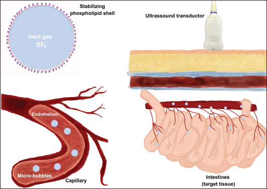 Fig. 4. Representative image of a microbubble used as an ultrasound contrast agent. The material consists of a lipidcoated membrane filled with gaseous content. The lumen is filled with sulfur hexafluoride (SF6). The figure was created using the Penup Samsung® application (Windows 11, Ldta, Samsung Electronics, Suwon, South Korea) and Canva Pro® (Canva Pty Ltd, Sydney, Australia). The product most commonly used in this technique is sulfur hexafluoride, a contrast element capable of remaining stable inside the vessels without diffusing through the vascular bed. The medium also has the potential to remain in the bloodstream for prolonged periods due to its low solubility in water and the high molecular weight of its gaseous molecules, which makes it resistant to external pressure (Volta et al., 2014) and is excreted by the lungs (Nyman et al., 2005). It can be administered mainly by two routes: intravenous and intracavitary (Takahashi et al., 2021). Contrasts have a low capacity to cause adverse reactions. In veterinary medicine, syncope and emesis are described after 24 hours of use (Seiler et al., 2013). In medicine, there are few reports of headaches, nausea, and increased body temperature after CEUS (Haers et al., 2010). The product is contraindicated for individuals with hypersensitivity reactions to any component of the contrast medium (Takahashi et al., 2021). The safety profile of the material used to perform CEUS has been extensively studied in children and has been shown to be highly safe with discrete, self-limiting, or easily reversible reactions (Rosado and Riccabona, 2016; Mao et al., 2019). The intravenous administration of CEUS is indicated for assessing intestinal perfusion. After application, the microbubbles are restricted to the intravascular space without entering the organ parenchyma (Fig. 5). Contrast media classified as second generation can remain in the vascular bed for approximately 10 minutes, and as the bubbles break, they are gradually eliminated through respiration (Takahashi et al., 2021). The physical properties of using microbubbles are due to the nonlinear detection that bubbles of different sizes produce when they are diluted in the patient’s blood and meet ultrasound echoes and, consequently, produce harmonic frequencies. The oscillation of this material in the evaluation region generates an intense contrast enhancement on the surface of the organ, as shown in the USG image, allowing microcirculation to be observed (Nyman et al., 2005). The image parameters used to evaluate this imaging method are related according to the degree of homogeneous or heterogeneous filling of the organ’s microcirculation by the microbubbles, mainly in specific circular regions within the tissues being examined. This defines the intensity patterns as “hyperintense” in tissues with greater intensity of visualization of the contrasted region, “isointense” in which it is not possible to distinguish the tissue adjacent to the evaluated region even with the use of contrast and “hypointense”, which determines a pattern of low intensity (Volta et al., 2014).