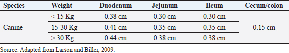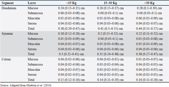 Table 2. Reference values for the thickness of the intestinal wall layers (in cm) of healthy dogs according to body weight with segmentation of values with variations in measurements according to each layer (mucosa, submucosa, muscle and serosa).