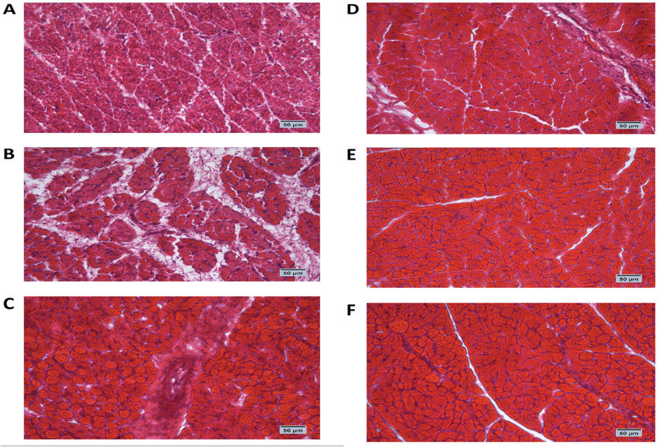 Fig. 2. Cross-section of thigh muscle at ED18 and post-hatching at day 10 stained by H&E stain under magnification power ×40 showing differences in myofiber diameter by light microscopy. (A) Control at ED18=37.8°C; (B) TM1 at ED18 from ED 4–7 at 39°C for 18 hours; (C) TM2 at ED18 from ED 7–10 at 39°C for 18 hours. The three figures showed clear connective tissue formation that appeared as white fibers within the muscular tissues. (D) the control at post-hatch at day 10 at 37.8°C; (E) TM1 at post-hatch day 10 from ED 4–7 at 39°C for 18 hours; (F) TM2 at post-hatch day 10 from ED 7–10 at 39°C for 18 hours. The D, E, and F figures showed that the connective tissues were replaced with clear myocyte, indicating an increased mass of the muscular tissues. Impact of heat treatment on Myf-5, MyoD, MyoG, IGF-1, GH, and MyoS mRNA gene expressionFor the pectoral muscle, the heat manipulation results in ED7 revealed that MyoS mRNA expression in TM1 was significantly higher than that in the control group. However, the mRNA expression of Myf-5, MyoD, MyoG, IGF-1, and GH in TM1 did not differ significantly from that in the control group (Table 5). In the thigh muscles, the MyoD, IGF-1, GH, and MyoS mRNA gene expressions in TM1 were significantly higher than those of the control group, whereas Myf-5 and MyoG mRNA gene expressions were not statistically different from those of the latter group. The results of ED10 showed that the mRNA expression of Myf-5, MyoD, IGF-1, and MyoS in TM2 was considerably higher than that in the control group in the pectoral and thigh muscles. GH and MyoG mRNA gene expression in the TM2 pectoral and thigh muscles did not differ significantly from that in the control. Heat treatment of TM2 increased Myf-5 and MyoG mRNA expression in the ED18 pectoral and thigh muscles compared with the control and TM1 muscles. Additionally, compared with the control group, the pectoral and thigh muscles of TM1 and TM2 exhibited significantly lower MyoS gene expression. Additionally, the results demonstrated that there was no discernible impact of TM on MyoD and IGF-1 mRNA expression in the pectoral and thigh muscles of TM1 and TM2, in contrast to the control group. When comparing the expression of GH in TM1 or TM2 with the control in the thigh muscle, Table 5 shows that there was no discernible change. Furthermore, compared with the control, the mRNA expression levels of GH in the pectoral muscle were significantly lower after TM of TM1 and TM2 at ED18. Myf-5, MyoD, MyoG, IGF-1, and GH mRNA gene expression was significantly higher in the TM2 pectoral and thigh muscles than in the control group, according to the results of post hatch day 10. Furthermore, compared with the control group, Table 5 showed that TM2 considerably reduces MyoS expression in the pectoral and thigh muscles. In addition, the TM1 data revealed a significant increase in the expression of MyoD and IGF-1 mRNA genes in pectoral muscle compared with the control. However, there was minimal difference between the control and TM1 thigh muscles in terms of Myf-5, MyoD, MyoG, IGF-1, GH, and MyoS mRNA expression. Table 4. Muscle Hsp60, Hsp70, Hsp90, and Hsp108 mRNA relative quantification duringembryogenesiss (ED7 and ED10) and posthatch day 10.