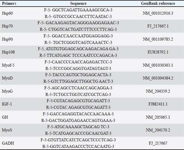 AbstractBackground: Native Saudi chickens have the genetic capacity to develop well and produce eggs in hot environments, allowing them to withstand heat stress. Thermal alteration is one of the most significant strategies to genetically improve muscle growth and growth performance during embryogenesis. Aim: This study assessed the impact of temperature on the hatchability, body weight (BW), and myofiber diameter of the pectoral and thigh muscles of native Saudi chickens. Methods: In this study, 300 viable eggs were equally divided and randomly divided into three groups. The control group was maintained at 37.8°C with 56% relative humidity (RH). The other two groups thermomodulated (TM1 and TM2) were subjected to temperature manipulation and kept at 39°C for 18 hours daily at 65% RH during the embryonic days (ED 4–7 and ED 7–10, respectively. Changes were identified by analyzing paraffin slices of the thigh and pectoral muscles. Results: The hatchability rate was somewhat higher in the TM1 and TM2 groups than in the control group, but there was no appreciable shift in the embryonic BW. The TM2 group had a significantly higher BW on post-hatch days 10 and 15 than the TM1 and control groups. Furthermore, compared with the TM1 and control groups, the TM2 group’s pectoral and thigh myofiber diameters were considerably more significant. Thus, without negatively impacting the hatchability rate or embryonic BW, the morphometric outcomes of the TM2 pectoral and thigh muscles during ED 7–10 increased the sensitivity of the pectoral and thigh muscles to heat stress. Gene expression analysis revealed that heat shock proteins were more highly expressed in the TM1 thigh muscle than in the control group, with heat shock proteins (Hsp)70 showing a higher expression than Hsp60, Hsp90, and Hsp108. In contrast, there was no appreciable change in the mRNA expression of Hsp60, Hsp70, and Hsp108 in the thigh muscle when TM1 was heated in the ED18 group. Conclusion: Thus, commercial breeders can use thermal manipulation to improve the muscle growth of local chickens in the Kingdom of Saudi Arabia. Keywords: Embryogenesis, Fiber diameter, Pectoral muscle, Thigh muscle, Thermal manipulation. IntroductionBecause of their tasty meat and eggs, resistance to various infectious diseases, and tolerance to extreme heat, native Saudi chickens are important socioeconomic elements to smallholder communities (Fathi et al., 2017). Acute heat stress exposure in hens results in a decline in growth performance, affecting the quantity and quality of meat produced, leading to a high death rate and significant financial losses (Nawaz et al., 2021). According to Yacoub and Fathi (2013), native Saudi chickens have the genetic capacity to develop well and produce eggs in hot environments, allowing them to withstand heat stress. Thermal change is one of the most important methods for genetically enhancing muscle growth and growth performance during embryogenesis. This low-cost approach aims to counteract the detrimental effects of heat stress in hot regions, such as Saudi Arabia (Loyau et al., 2013; Dasari et al., 2021; Ali et al., 2022; Dalab et al., 2022). Early embryogenesis is when poultry myofiber is first formed, and before a bird hatches, the total number of muscle fibers is nearly set (Wang et al., 2022). Early embryogenesis, which continues through adulthood until the ultimate mature size and strength obtained, is intimately linked to molecular and cellular mechanisms (myoblasts proliferation and myocytes differentiation) that govern the histogenesis of embryonic pectoral and thigh muscle fibers (Wang et al., 2022). The growth of posthatch muscle and the final quantity and quality of meat depends on muscle development during the embryonic stage (Wang et al., 2022). The hallmark of post-hatch muscle growth is an increase in myofiber size, which is associated with an increase in cytoplasmic volume but not with an increase in myofiber quantity (Mozdziak et al., 1994, 2000). Heat shock proteins (HSPs) are ubiquitous proteins present within the cellular or extracellular milieu. HSPs are primarily responsible for preserving the integrity and structure of cellular membranes under heat stress. Moreover, HSPs regulate some subsets of processes such as protein folding, degradation, aggregation, assembly, transportation of newborn proteins, and stabilization events within cellular compartments (Sharma et al., 2020). HSPs are mainly expressed under various stress conditions, such as heat, and their expression levels vary based on environmental conditions (Alagar Boopathy et al., 2022). To the best of our knowledge, no previous research has examined how heat modification timing affects hatchability and muscle fiber diameter in native Saudi chicken embryogenesis. The genetic mechanisms behind embryonic thermal manipulation and the gene expression of HSPs (Hsp60, Hsp70, Hsp90, and Hsp70) in the pectoral and thigh muscles are also revealed by morphometric examination of the myofiber diameter. Therefore, our research aimed to examine how early embryonic heat manipulation affects the fibers of the pectoral and thigh muscles to enhance body growth performance through modification of the myofiber diameter. To provide further insight into the molecular processes that underlie heat stress during embryogenesis, this study assessed the expression profile of HSP candidate genes in the pectoral and thigh muscles of native Saudi chicken. Thus, the findings of this study may help commercial breeders produce and enhance the growth efficiency of native Saudi chicken. Materials and MethodsPlan and incubation managementAll protocols regarding samples, experimental incubation, hatching management, and the conditions were approved by the King Faisal University Animal Care and Use Committee (KFU-ACUC). Three hundred viable eggs were provided from King Faisal University’s agricultural research station farms (from a 105-week-old flock) at Al-Hassa,