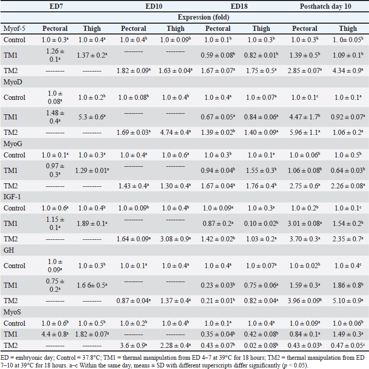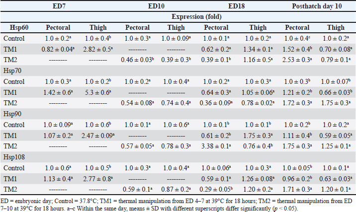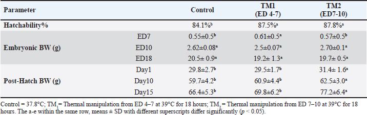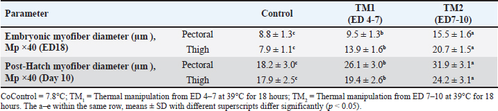 Statistical analysis The chi-square test was used to investigate hatchability. However, body weight (BW), morphometric examination of the fiber diameter of the pectoral and thigh muscles, and the mRNA gene expression of Hsp60, Hsp70, Hsp90, Hsp108, Myf-5, MyoD, MyoG, IGF-1, GH, and MyoS were expressed as means ± SE. Using IBM SPSS statistics 20 (IBM software, Chicago, USA), various parameters were examined for each treatment group using one-way ANOVA and all-pairs Bonferroni tests. When p < 0.05, a difference is deemed significant. Ethical approval All protocols about samples, experimental incubation, hatching management, and circumstances were approved by the KFU-ACUC. ResultsEffects of thermal manipulation on BW and hatchabilityTable 2 summarizes the impact of TM during embryogenesis on myofiber diameter, BW, and hatchability. Compared with the control group, thermal modification of TM1 and TM2 at ED4-7 and ED7-10 improved the hatchability rate. In addition, the TM groups showed improved embryonic BW in ED7 compared with the control group. Conversely, at ED10 and ED18, neither TM1 nor TM2 significantly affected embryonic BW. Compared with the control and TM1 groups, the TM2 group had considerably greater BW on posthatching days 1, 10, and 15. Impact of heat treatment on myofiber diameterThe myofiber cells of the pectoral and thigh muscles were analyzed in each group. The diameters of the myofiber in the embryonic pectoral and thigh muscles varied from 8.8–15.5 to 7.9–20.7 μm, respectively (Table 3). On the other hand, the myofiber diameters of the posthatched pectoral and thigh muscles varied from 18.2–31.9 to 17.9–24.2 μm, respectively (Table 3, Fig. 1). Furthermore, at both the embryonic and post-hatch ages, there were significant differences in pectoral myofiber diameters across all treatment groups, with TM2 exhibiting a more significant difference than TM1 and the control. Additionally, TM1 markedly increased pectoral myofiber diameters compared to the control at both the embryonic and post-hatch ages. The thigh myofiber measurement revealed significant variations in myofiber diameters between the TM1, TM2, and the control group, with TM2’s myofiber diameters showing greater significant differences than TM1’s and the control group (Table 3 and Fig. 2). At ED18, the comparative histometrical and histological results between the pectoral and thigh myofiber diameters showed that the thigh myofiber diameter was remarkably higher only in the TM1 and TM2 groups compared with the myofiber diameter of the pectoral muscle, with the highest value of the thigh myofiber diameter in the TM2 group (Figs. 1 and 2, Table 3). The comparative histometrical and histological results of post-hatch day 10 showed that the pectoral myofiber diameters were significantly higher in the TM1 and TM2 groups compared with the myofiber diameters of the thigh muscle in all treated groups, with the most significant increase in the pectoral myofiber diameter in the TM2 group (Figs. 1 and 2, Table 3). Table 2. The effects of TM on hatchability and BW.