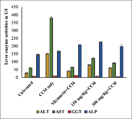 Fig. 2. Comparison of liver ALT, AST, GGT, and ALP activities in study groups. Untreated (negative control), CCl4 only (positive control), Silymarin+CCl4 (silymarin control), 150 mg/kg (low dose), and 300 mg/kg (high dose).