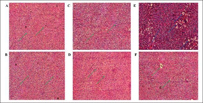 Fig. 3. Histological sections of the liver in the A and B groups: negative control, C: low-dose, D: high-dose, E: positive control, and F: silymarin control groups. The blue and green arrows indicate abnormal liver cells and normal hepatocytes, respectively.