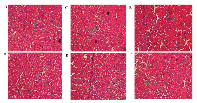 Fig. 4. Histological sections of the kidneys in the A and B: negative control, C: low-dose, D: high-dose, E: positive control, and F: silymarin control groups. The blue and green arrows indicate abnormal kidney and normal renal cells, respectively. The enzyme activity was significantly higher in the CCl4-treated group than in the control group, indicating liver and kidney cell damage. However, S. nigrum administration at both doses significantly reduced ALT and AST activities, whereas GGT and ALT activities remained unchanged after 14 days. This study revealed that S. nigrum extract protects against CCl4-induced liver and kidney damage. Microscopic analysis confirmed these protective effects, revealing the presence of normal liver cells in the S. nigrum-treated group. In contrast, the CCl4 group exhibited fatty liver, cell death, abnormal growth, infiltration, inflammation, reduced glomerular mass, and tubular cell death in the kidney sections. Studies in albino rats have indicated that S. nigrum leaves protect the liver and kidneys from CCl4-induced damage (Elhag et al., 2011; Elshater et al., 2013; Krithika and Verma, 2018; Salman et al., 2018; Krithika and Verma, 2019). In addition, Ozturk et al. (2003) demonstrated that CCl4 induces nephrotoxicity by increasing superoxide dismutase and catalase (Ozturk et al., 2003). The aqueous and methanolic extracts of S. nigrum significantly reduced serum AST, ALT, ALP, and bilirubin levels in treated subjects compared with the untreated group (Elhag et al., 2011). Similarly, the ethanol extract showed significant liver-protective effects, as demonstrated by biochemical markers, such as serum AST, ALT, and bilirubin levels, as well as histopathological assessments (Liu et al., 2016). Plants offer protective benefits owing to the antioxidant properties of their phenolic compounds, phenols, and tannins (Kabbashi et al., 2024). In addition, S. nigrum inhibits 2-acetylaminofluorene-induced hepatocarcinogenesis, which is linked to increased expression of glutathione S-transferase-alpha, glutathione peroxidase, superoxide dismutase-1, and catalase (Supraja et al., 2022; Akinwumi et al., 2024). This study has several limitations, including the lack of measurement of ammonia, acute inflammation indicators, and antioxidant enzymes, which are crucial for understanding how S. nigrum protects liver and kidney cells. In addition, the lack of clinical data hinders the corroboration of these findings. ConclusionOur study investigated the antioxidant, hepatoprotective, and renoprotective effects of S. nigrum leaf extract against CCl4-induced toxicity. The results demonstrated that S. nigrum exhibits antioxidant activity and protects against CCl4-induced hepatotoxicity and renotoxicity. The IC50 of S. nigrum extract is 58.3 μg/ml. S. nigrum leaf extract significantly reduces ALT and AST activities, and mitigates hepatocyte and nephron damage induced by CCl4 exposure. These findings underscore the potential of S. nigrum as a safe, effective, and promising natural herbal medicine. Further research is needed to fully understand the mechanisms by which S. nigrum protects against cellular damage. AcknowledgmentsNone. Conflict of interestThe authors declare no conflict of interest. FundingNone. Authors contributionsConceptualization, T.I.S., A.S.K., E.S.B., R.A.G., E.J.Y., R.F.M., and A.M.I.; proposed and designed compounds, T.I.S., A.S.K., E.S.B., R.A.G., E.J.Y., R.F.M., and A.M.I.; conducting experiments, A.S.K., and T.I.S.; writing-original draft preparation, A.M.I, T.I.S., O.H.A., and A.S.K.; writing-review and editing, A.S.K., T.I.S., O.H.A., and A.M.I. All authors have reviewed and approved this study. Data availabilityThe data used in this study are available in the manuscript. ReferencesAlshawsh, M.A.M. 2013. Hepatoprotective, immunomodulatory and antibacterial effects of selected Malaysian medicinal plant extracts. Malaysia: University of Malaya. Akinwumi , K.A., Eleyowo, O.O., Odesola, K.A., Adegboyega, A.M., Okon-Ben, V.M. and Onapelumi, A.T. 2024. Ethanol leaf extract of Acrostichum aureum modifies carbon tetrachloride-induced oxidative stress and hepato-renal damage in rats. Trop. J. Nat. Prod. Res. 87388-7396.. Ali, S.A., Sharief, N.H. and Mohamed, Y.S. 2019. Hepatoprotective activity of some medicinal plants in Sudan. Evid. Based Complem. Altern. Med. 2019, 1 -16. Arunachalam, G., Subramanian, N., Pazhani, G.P., Karunanithi, M. and Ravichandran, V. 2009. Evaluation of anti-inflammatory activity of methanolic extractof Solanum nigrum (Solanaceae): anti-inflammatory effect of Solanum nigrum Linn extract. Iran. J. Pharm. Sci. 5, 151–156. Cai, J., Zhang, X.J. and Li, H. 2019. Progress and challenges in the prevention and control of nonalcoholic fatty liver disease. Med. Res. Rev. 39(1), 328–348. Carresi, C., Musolino, V., Gliozzi, M., Maiuolo, J., Mollace, R., Nucera, S., Maretta, A., Sergi, D., Muscoli, S. and Gratteri, S. 2018. Antioxidant effect of bergamot polyphenolic fraction counteracts doxorubicin-induced cardiomyopathy: role of autophagy and c-kitposCD45negCD31neg cardiac stem cell activation. J. Mol. Cell. Cardiol. 119, 10–18. Elhag, R., El Badwi, S., Bakhiet, A. and Galal, M. 2011. Hepatoprotective activity of Solanum nigrum extracts on chemically induced liver damage in rats. J. Vet. Med. Anim. Health. 3, 45–50. Elshater, A.E.A., Salman, M.M.A. and Mohamed, S.A. 2013. The hepato-ameliorating effect of Solanum nigrum against CCL4 induced liver toxicity in Albino rats. Acad. J. Biol. Sci. C Physiol. Mol. Biol. 5, 59–66. Eze, G.I. and Akonoafua, K.A. 2019. Effects of ethanol leaf extract of Lawsonia inermis Linn. on carbon tetrachloride-induced liver injury in adult Wistar rats. Trop. J. Natl. Prod. Res. 3(8). Guan, Y.S. and He, Q. 2015. Plants consumption and liver health. J. Evid. Based Complementary Altern. Med. 2015, 824185. Hameed, I.H., Cotos, M.R.C. and Hadi, M.Y. 2017. A review: Solanum nigrum L. antimicrobial, antioxidant propert