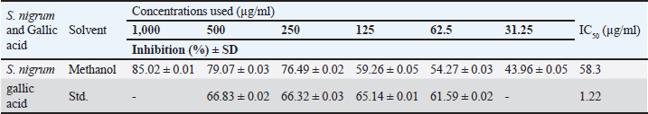 AbstractBackground: There is growing interest in natural antioxidants, particularly Solanum nigrum (S. nigrum), because of their potential to protect against oxidative stress-induced organ damage and their intriguing historical use in treating various medical conditions. Aim: This pioneering study examined the unique antioxidant, hepatoprotective, and renoprotective effects of S. nigrum methanolic leaf extract on carbon tetrachloride (CCl4)-induced toxicity in albino rats. Methods: Thirty albino rats (100–120 g) were used. The 2.2 di-(4-tretoctylphenyl)-1-picrylhydrazyl radical scavenging assay was used to evaluate the antioxidant properties of S. nigrum extract. This study examined the protective effects of 150 and 300 mg/kg leaf extract against CCl4-induced toxicity. Body weight, hematological markers, and kidney and liver function were assessed. Histological analysis of liver and kidney tissue was performed. Results: The radical scavenging activity of S. nigrum was a remarkable 85.02 ± 0.01 RSA%, compared to 66.83 ± 0.02 RSA% for gallic acid, with IC50 values of 58.3 and 1.22 μg/ml, respectively. Solanum nigrum treatment significantly decreased alanine transaminase and aspartate transaminase activities relative to CCl4-induced toxicity, a finding of significance in pharmacology and toxicology. Conclusion: The S. nigrum methanolic extract has an IC50 value of 58.3 μg/ml, demonstrating potent natural antioxidant properties that mitigate hepatotoxicity and renotoxicity induced by CCl4. Keywords: Antioxidant, Hepatoprotective, S. nigrum leaf, Methanolic extract, Albino rats. IntroductionLiver and kidney disorders significantly threaten human health and pose significant global public health challenges (Cai et al., 2019). Their widespread prevalence and impact complicate medical interventions and often render them ineffective (Alshawsh, 2013). Medications and environmental toxins are primarily countered by the liver and kidneys, which serve as protective barriers (Akinwumi et al., 2024). Hepatotoxicity and renotoxicity are influenced by several primary factors, including dietary additives, alcoholic beverages, toxic substances, medicinal drugs, and environmental contaminants (Melaram, 2021). This situation has sparked increased attention to alternative and complementary treatment approaches. Herbal remedies, with their potential protective effects, could be a reassuring addition to the arsenal against toxicity (Ali et al., 2019). Plants have been reported to have significant therapeutic potential in protecting against the oxidative stress, cell injury, and necrosis-associated effects of exposure on toxins and pollutants. Reactive oxygen species (ROS) play a crucial role in pathological changes that lead to hepatocellular and exocellular damage (Allameh et al., 2023). Free radicals, particularly ROS like hydroxyl radicals and hydrogen peroxide, cause tissue damage and contribute to various diseases through lipid peroxidation and DNA mutations. Antioxidant-rich herbal remedies can effectively prevent this cellular damage and offer protection against these diseases (Jomova et al., 2023; Ifeanyi, 2018). Human exposure to CCl4 can occur through inhalation, ingestion, and skin contact. The metabolic activation of CCl4 leads to harmful free radicals, which cause lipid peroxidation, oxidative stress, and cellular damage, resulting in liver conditions such as necrosis, steatosis, fibrosis, and cirrhosis. In addition, CCl4 affects the kidneys, causing acute tubular necrosis and decreased glomerular mass (Eze and Akonoafua, 2019). Herbal remedies have been used in traditional medicine for centuries. Current scientific research has examined the safety and efficacy of plant-derived therapies, particularly their hepatoprotective and renoprotective effects. Recent laboratory and animal studies have indicated that plant-based antioxidants, particularly flavonoids and phenolic compounds, effectively prevent cellular damage (Liu et al., 2016). Solanum nigrum, the largest genus of Solanaceae, is prevalent in subtropical and tropical regions of Africa, Australia, and parts of Asia, including China, India, and Japan. Studies of Solanum species have identified compounds such as steroidal saponins, alkaloids, terpenes, flavonoids, lignans, sterols, phenolic compounds, and coumarins. Solanum nigrum is traditionally used for various health issues, including pneumonia, tooth pain, stomach discomfort, tonsillitis, intestinal parasites, and general malaise. It possesses antioxidant, antiulcer, anticancer, hepatoprotective, diuretic, and antipyretic properties. This study aimed to investigate S. nigrum’s antioxidant potential and its protective effects against CCL4-induced liver and kidney toxicity in albino rats. Materials and methodsChemicals and reagentsOxford Lab Fine Chem LLP (India) sells carbon tetrachloride (CCl4). Liquid paraffin (Oxford Lab Fine Chem LLP, India), Formalin (Novochem Engineering, India), the standard drug Silymarin (Sigma-Aldrich), ethanol (SIGMA-ALDRICH, Germany), Xylene (Scien TEST-bioKEMIX GmbH, Germany), kits for liver enzymes and renal parameters (Humana, Germany), 2.2 di-(4-tretoctylphenyl)-1-picrylhydrazyl (DPPH) (Chemos GmbH & Co. KG. Germany), and Hematoxylin and Eosin (H&E) (Santa Cruz Biotechnology, Inc., USA). Collection and authentication of plantsThe S. nigrum plant was sourced from a local farm in Al-Wasita, north of Al-Bayda, Libya, in June 2024. The taxonomy section of the Botany Department at the University of Omar Al-Mukhtar authenticated this plant. After collection, the plants were segregated, washed, and dried in the shade at room temperature. The dried leaves were ground into powder using a mechanical herb grinder. Methanolic crude extractThe extraction process followed that of Arunachalam et al. (2009), with some modifications. Powdered S. nigrum leaves (50 g) were macerated in 250 ml of absolute methanol for 72 hours with shaking at room temperature. The extract