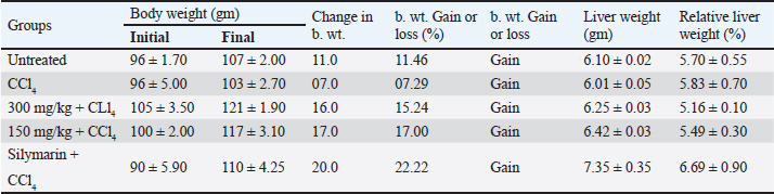 Table 2. Effects of S. nigrum extract on body weight, change in body weight (g), body weight, and relative liver weight in CCl4-induced hepatotoxicity.