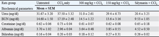 Open Vet. J.. 2025; 15(4): 1585-1592 Open Veterinary Journal, (2025), Vol. 15(4): 1585-1592 Research Article Antioxidant and protective effects of methanolic Solanum nigrum leaf extract against CCl4-induced hepatotoxicity and renotoxicity in albino ratsTaher Issa Shailabi1*, Ahmed Saeed Kabbashi2, Osama Hussein Aldeeb3, Eman Salah Basheer1, Rehab Aeyad Gumaa1, Ebtihal Jebriel Younes1, Retaj Fawzi Mohammed1 and Amar Mohamed Ismail21Department of Pharmacology and Toxicology, Faculty of Pharmacy, Omar Al-Mukhtar University, Al-Bayda, Libya 2Department of Biomedical Science, Faculty of Pharmacy, Omar Al-Mukhtar University, Al-Bayda, Libya 3Department of Biochemistry, Faculty of Medicine, Omar Al-Mukhtar University, Al-Bayda, Libya *Corresponding Author: Taher Issa Shailabi. Department of Pharmacology and Toxicology, Faculty of Pharmacy, Omar Al-Mukhtar University, Al-Bayda, Libya. Email: taher.mahmoud2014 [at] gmail.com and taher.issa [at] omu.edu.ly Submitted: 20/11/2024 Accepted: 14/03/2025 Published: 30/04/2025 © 2025 Open Veterinary Journal
