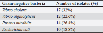 The study showed that the total number of bacterial isolates from 30 fresh samples was 53, and all the isolates were gram-negative bacteria. Two species were detected in 24 out of 30 samples (80%). The most frequently isolated organisms were Vibrio cholera (32%) followed by Proteus mirabilis (26.4%), Vibrio alginolyticus (22.6%), and E. coli. (18.8%) as shown in Figures 1 and 2. The bacteria isolated from Scomber japonicus are summarized in Table 2.