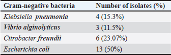 The results showed that the total number of bacterial isolates from 30 samples was 26. The bacteria isolated from S. japonicus are summarized in Table 4 in which all the isolates identified as gram-negative bacteria. During the bacterial isolation from Scomber japonicus, two of the 23 fish samples (8.6%) tested positive for multiple bacterial species. The results revealed that 76.6% (23/30) of S. japonicus samples yielded bacterial growth. The most frequently isolated organisms were E. coli (50%) followed by Citrobacter freundii (23.07%), Klebsiella pneumonia (15.3%), and finally V. alginolyticus (11.5%).